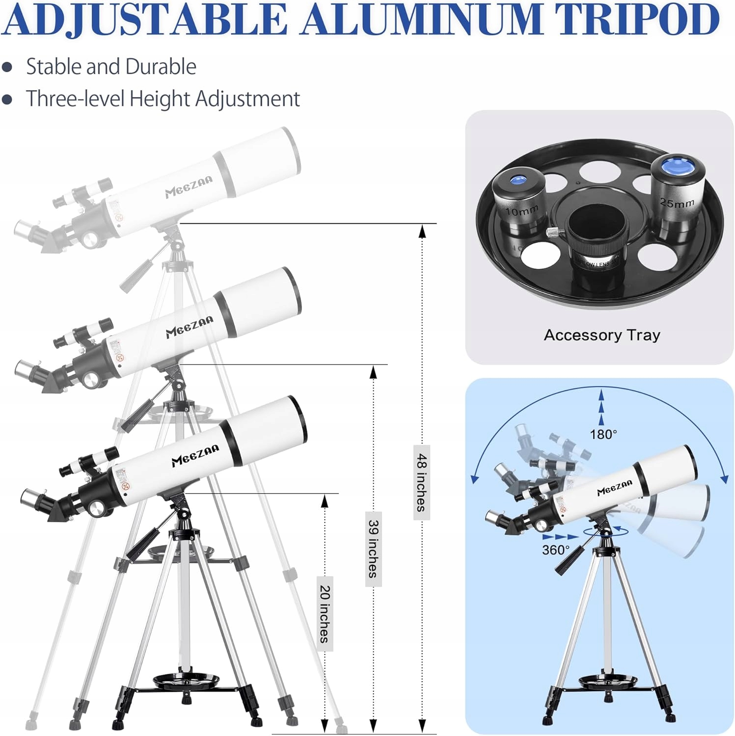 рефракционная телескоп meezaa 80/600 использует систему объектива, которая собирает свет и передает их в окуляр. Благодаря передаче с высоким светом изображения яркие и острые, и благодаря регулируемому штативу и простому сервису вы можете установить телескоп через несколько минут и начать наблюдение.