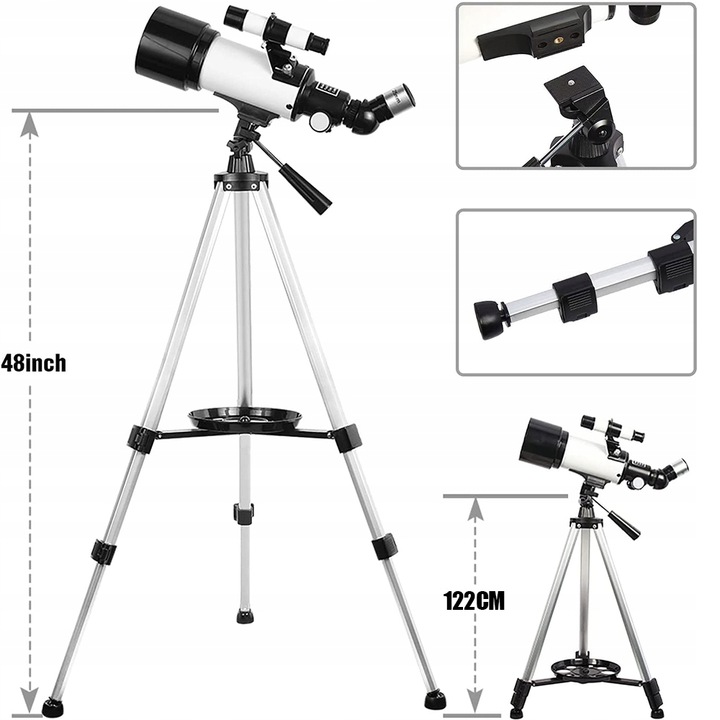 - Этот туристический телескоп 70AZ представляет собой простой в использовании телескоп-рефрактор с фокусным расстоянием 400 мм и апертурой 70 мм.