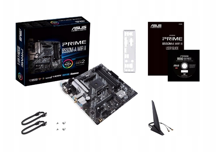 Включен в Mother плату Wi-Fi II Asus Prime B550M. Вы найдете 2x SATA-кабель, Wi-Fi 2,4/5 ГГц, антенну ввода/вывода, монтажные элементы, DVD и руководство пользователя в польском языке с гарантийными условиями.
