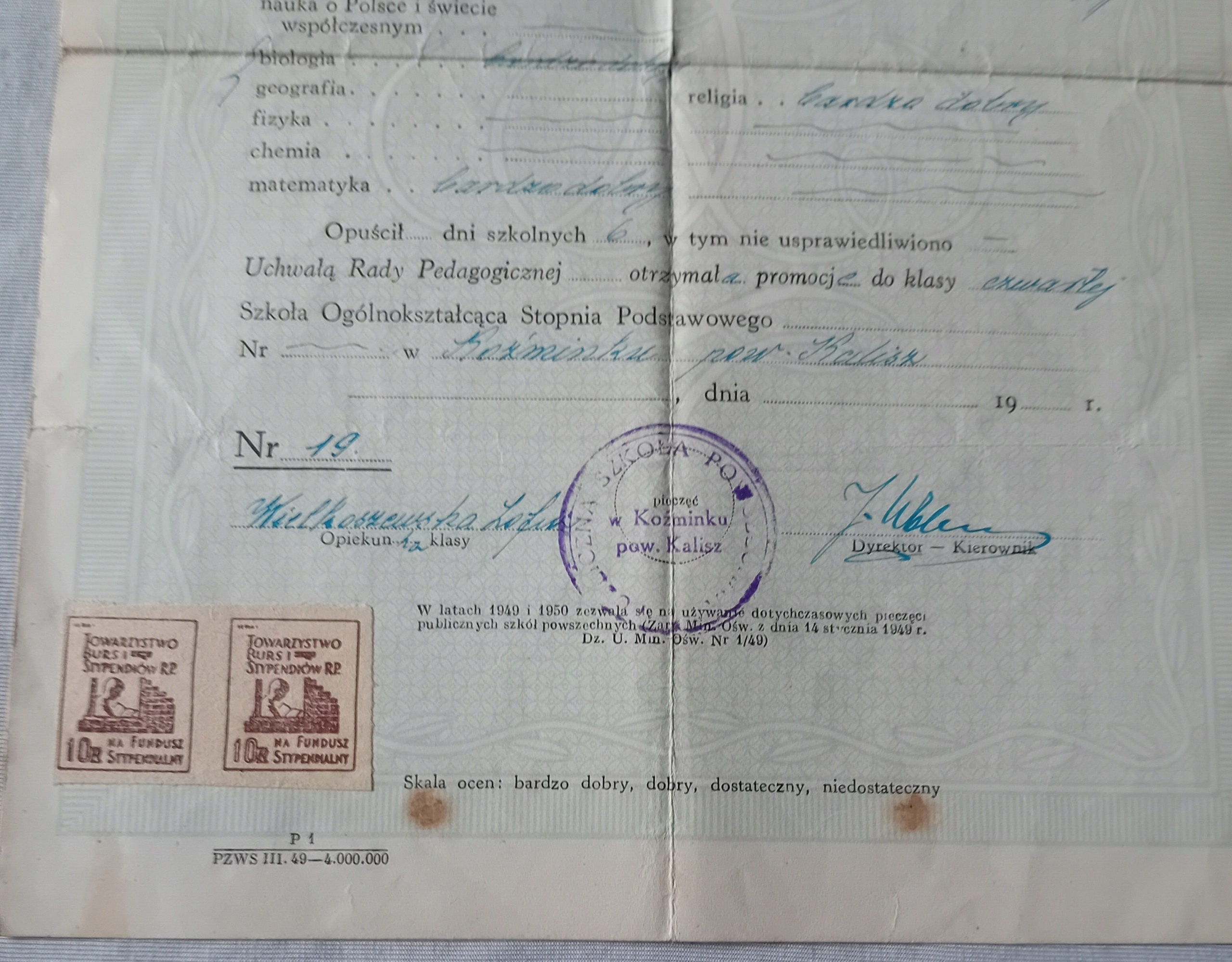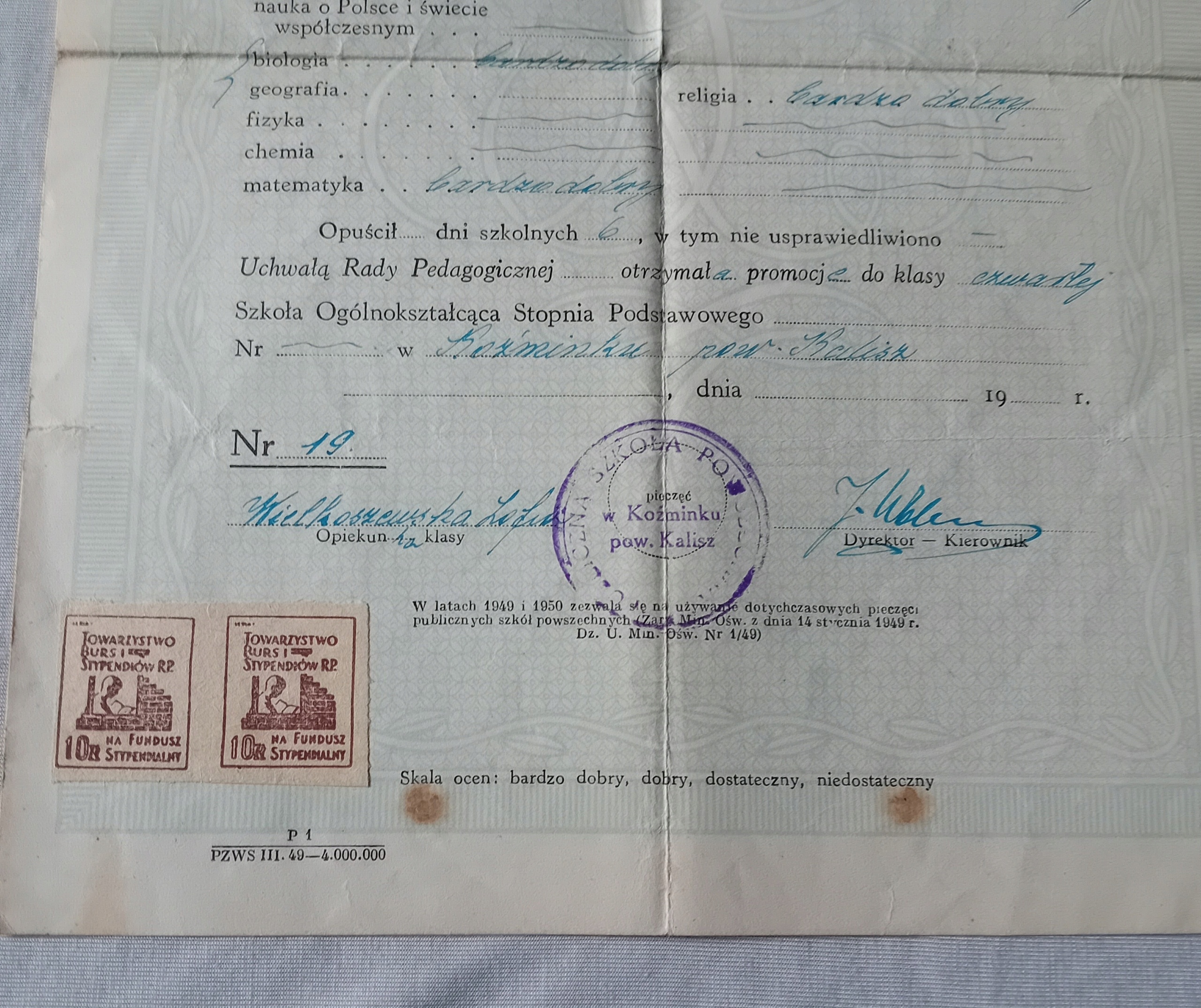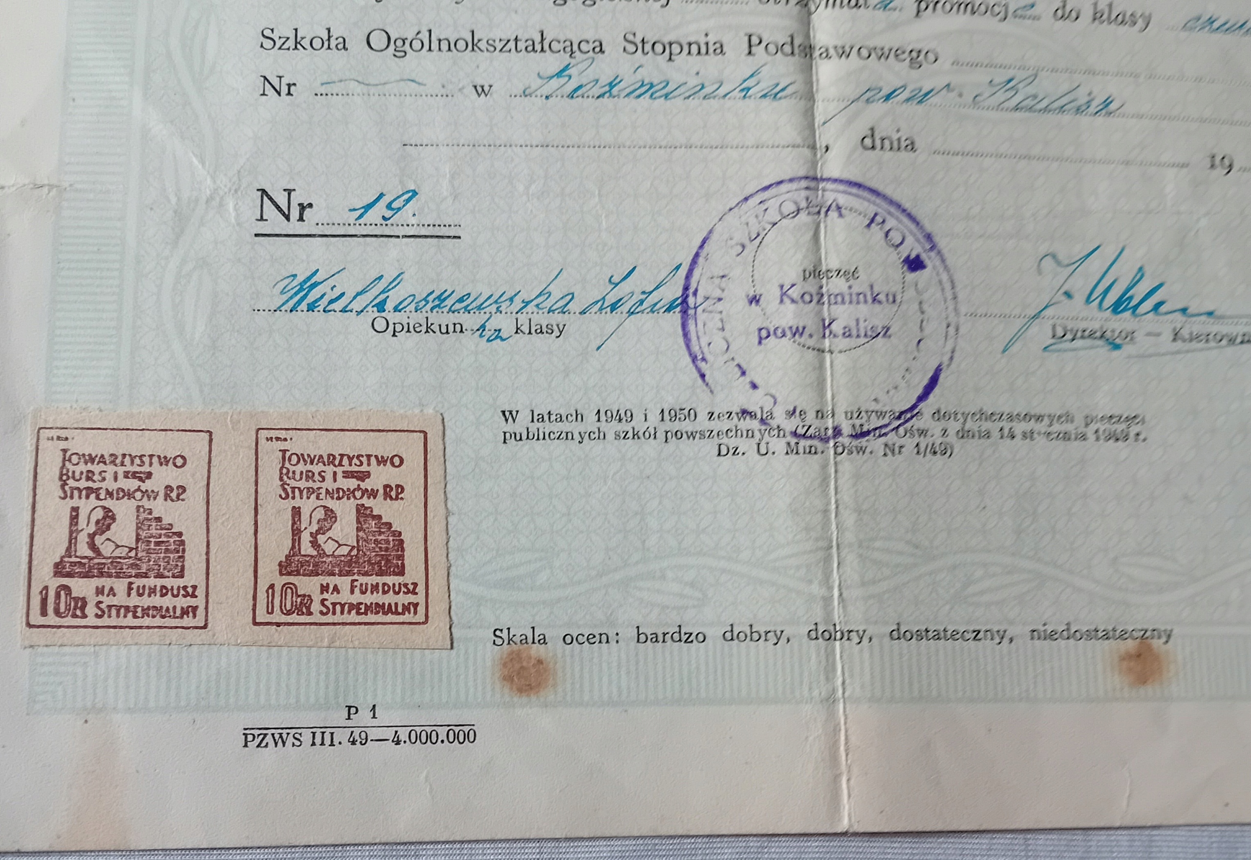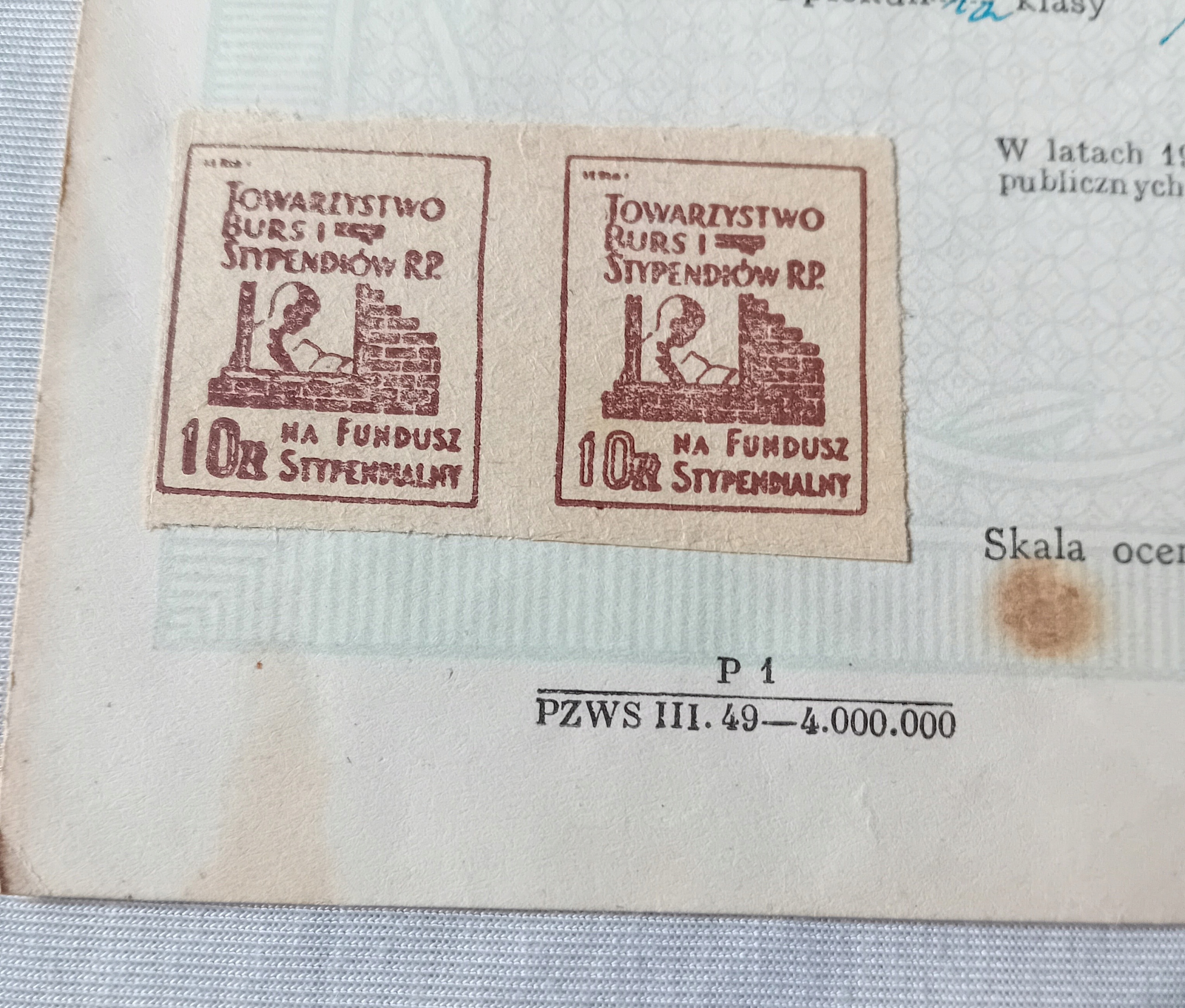Я продам сертификат окончания 3 -й школы базовой (базовой) степени за 1948/49 учебного года, выпущенную в 1949 году. В левом нижнем углу по двум маркам стипендиального фонда Общества взрыва и стипендий с номинанностью PLN 10. Довольно хорошее состояние. Сплошная бумага, согнутые углы, складные следы. На обороте 3 коричневых пятна, полупрозрачные на главную страницу.