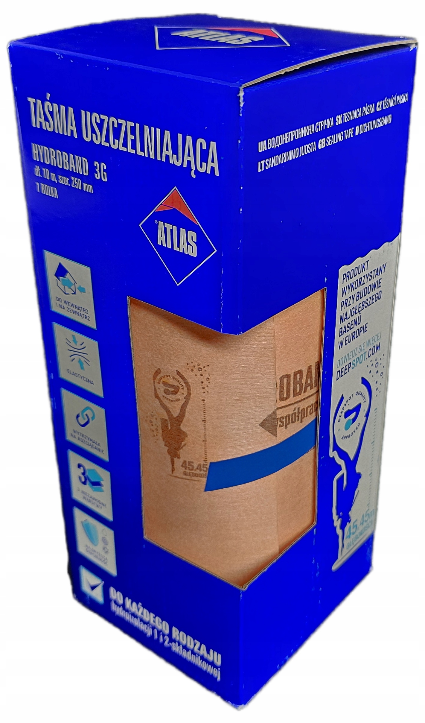 - Атлас гидробанд 3G Ширина ленты -двое: 125 мм (со шкалой и перфорацией) и 250 мм (без масштабирования и перфорации), для герметизации краев стен и напольных шпалов и разбивающихся разрывов,