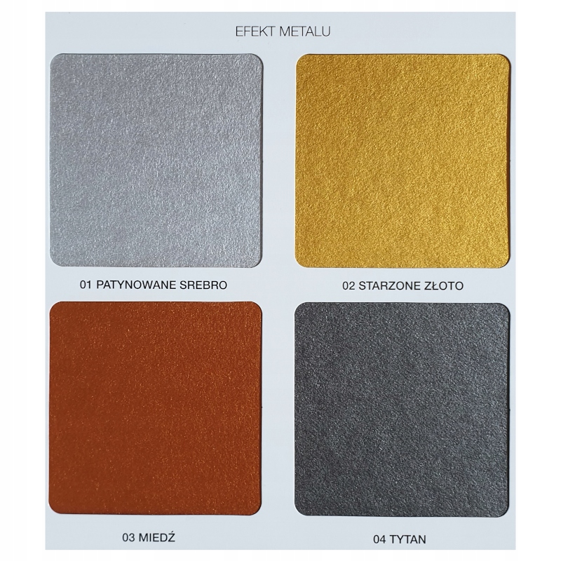 В наличии 4 цвета – цвета, имитирующие наиболее распространенные цвета металла: состаренное золото, патина серебро, титан, медь. Получаемый эффект зависит от цвета и степени развития основы, на которую нанесен лак.