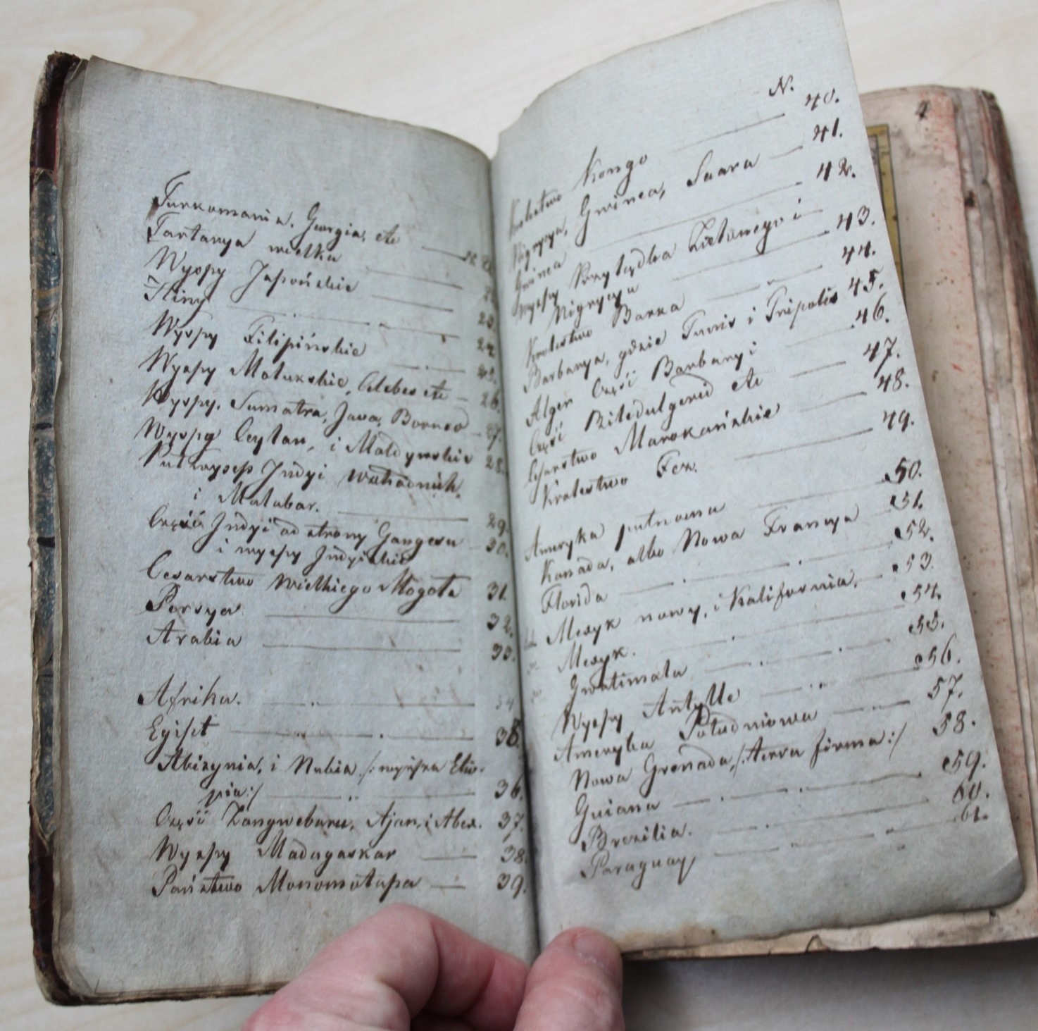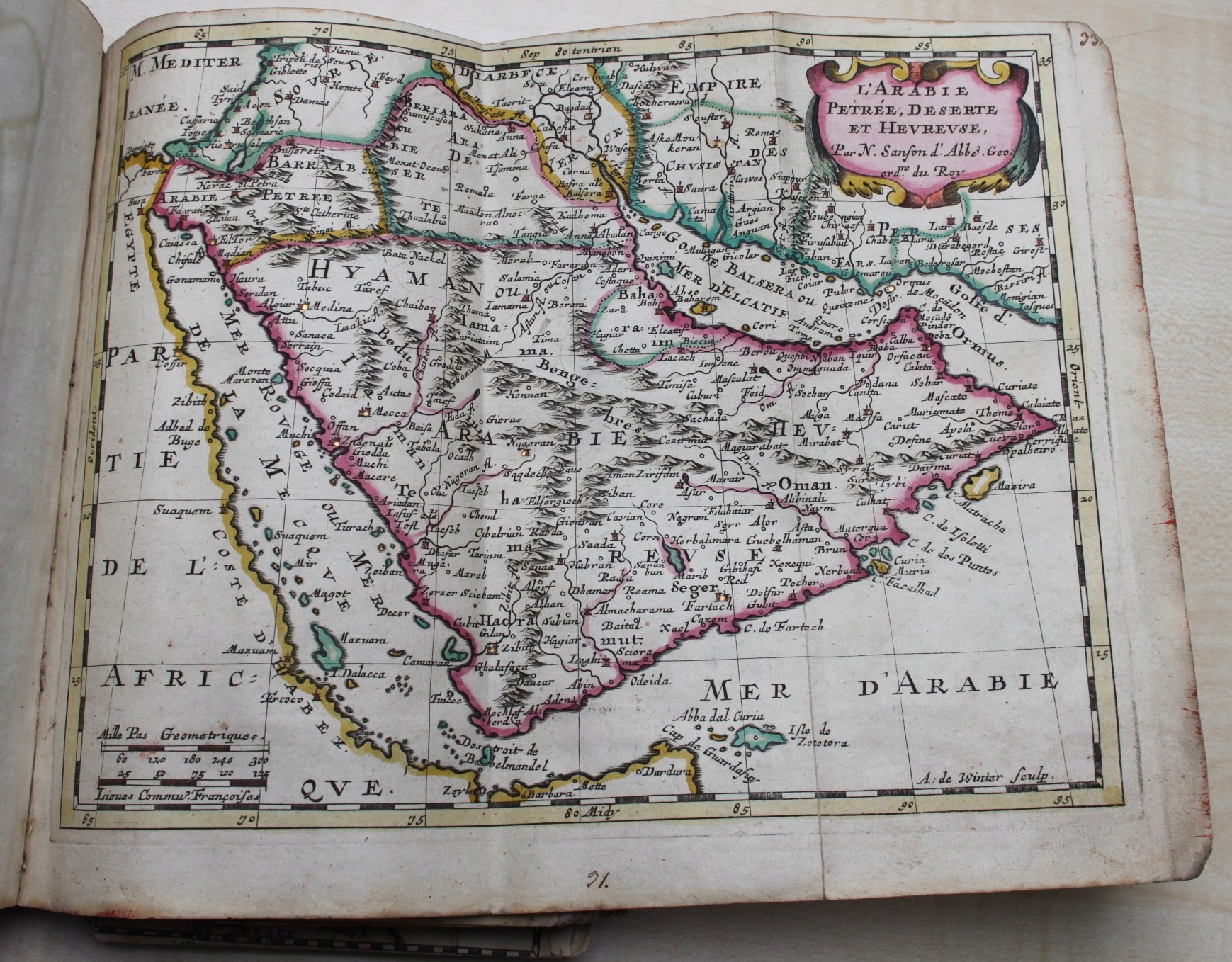 Голландское издание карманного атласа мира Николаса Сансона с рукописными заметками той эпохи (на обороте карт на польском языке, касающимися изучения географии). Помимо прочего, содержит карты Европы, Франции. ,Испания,Италия,Британия,Германия,Чехия,Венгрия,Греция,Турция,Канада,Америка Бразилия,Чили,Белая Россия и Московия,Китай,Япония,Аравия,Египет,Филиппины,Монголия,Мексика,Северная Африка.,Занзибар, Конго и многие другие.