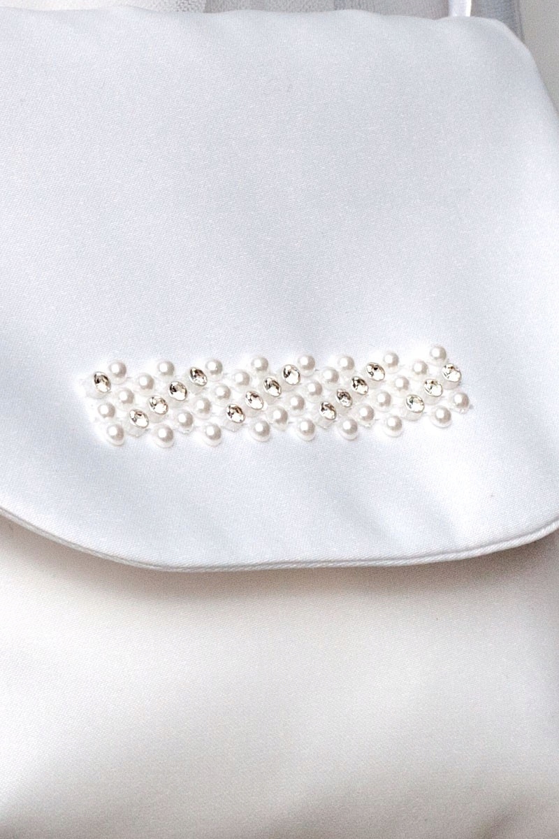 Мешочек для причастия из белого свадебного атласа с атласной завязкой для ношения через плечо. Сумка декорирована лентой с жемчугом и кристаллами, укрепленной изнутри, что придает ей красивый вид. Сумка застегивается на липучку.
