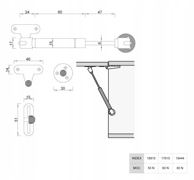 КОРОТКИЙ ГАЗЛИФТ ДЛЯ МЕБЕЛЬНЫХ ФАСАДОВ, ВЫТЯЖЕК 80Н АТМ