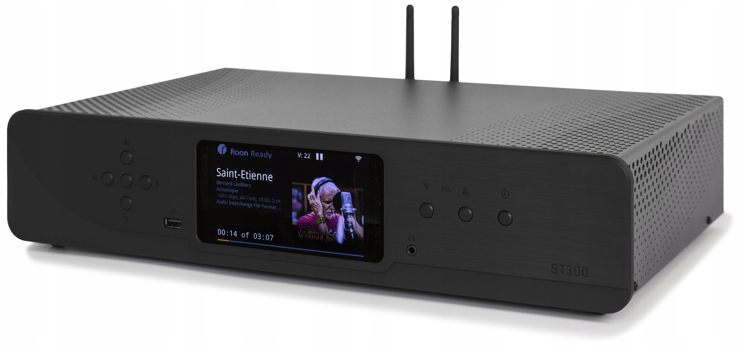 Дизайн устройства сохраняет традиции дизайна Атоллы. На передней панели расположен большой (5-дюймовый) цветной дисплей, на котором отображается воспроизводимый в данный момент альбом, его обложка, исполнитель, разрешение и файл — и ему есть что показать, поскольку ST300 поддерживает как файлы DSD, так и FLAC. как LPCM, ALAC, AIFF, WMA, OGG, WAV, AAC и, наконец, MP3. В стример можно «кормить» PCM-файлы с разрешением до 24бит/192кГц и DSD до DSD128, т.е. 5,6МГц.