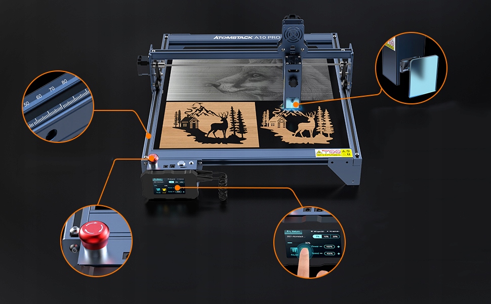 Защитная крышка панорамного стекла с фильтром может эффективно фильтровать 97% ультрафиолетового света. Он играет очень хорошую роль в защите глаз и предотвращает попадание лазерного пятна на вашего питомца. Лазерный гравер ATOMSTACK A10 Pro оснащен кнопкой аварийной остановки и секундомером для вашей безопасности.