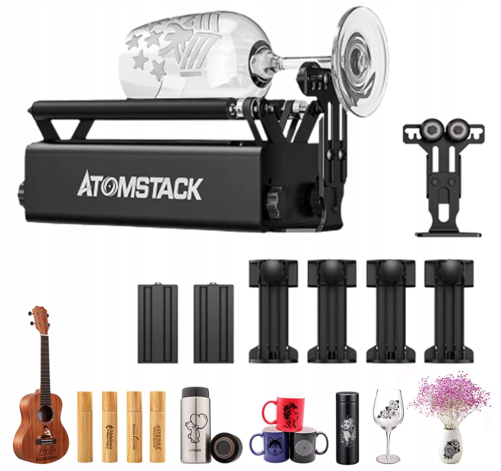 ATOMSTACK R3 PRO Лазерный вращающийся вал Лазерный гравер Ось вращающегося вала Y с вращением на 360° для лазерной гравировки цилиндрических банок для предметов (4 вспомогательных подъемных колонны + 2 вспомогательных опорных вала + 1 опорная рама)