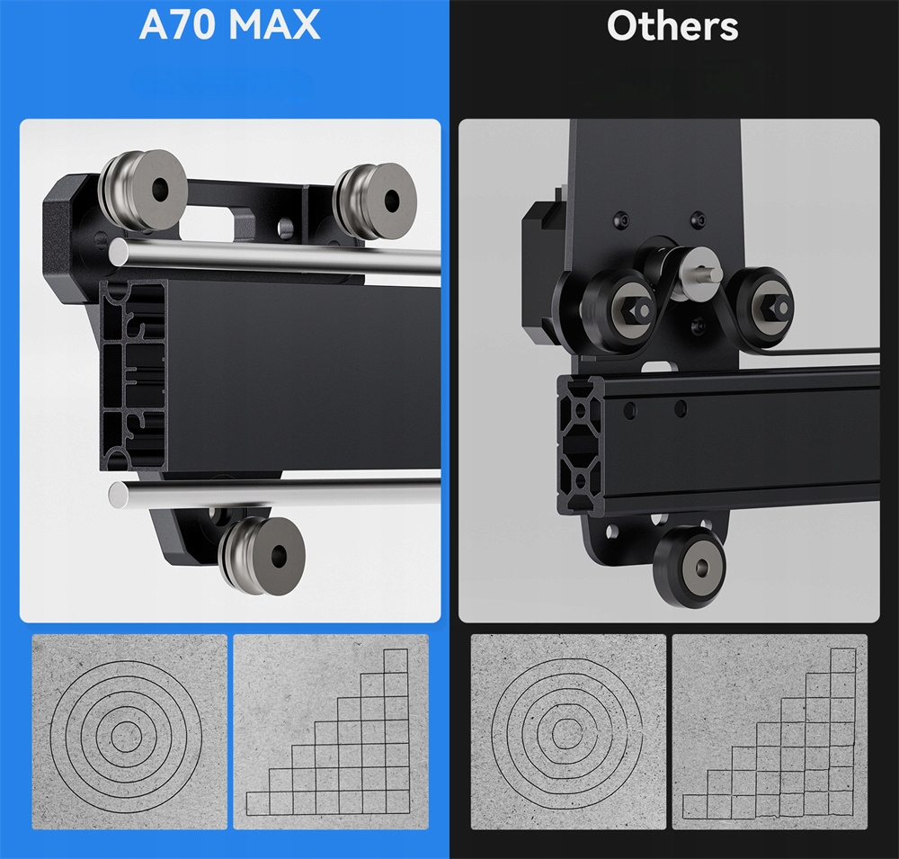 Чтобы обеспечить стабильную работу на высокой скорости, в трех осях машины была использована новая двухсторонняя рельсовая конструкция с низким центром тяжести, стабильной работы на высокой скорости, тихой операции, подходящей для жестких браков и работы по сокращению