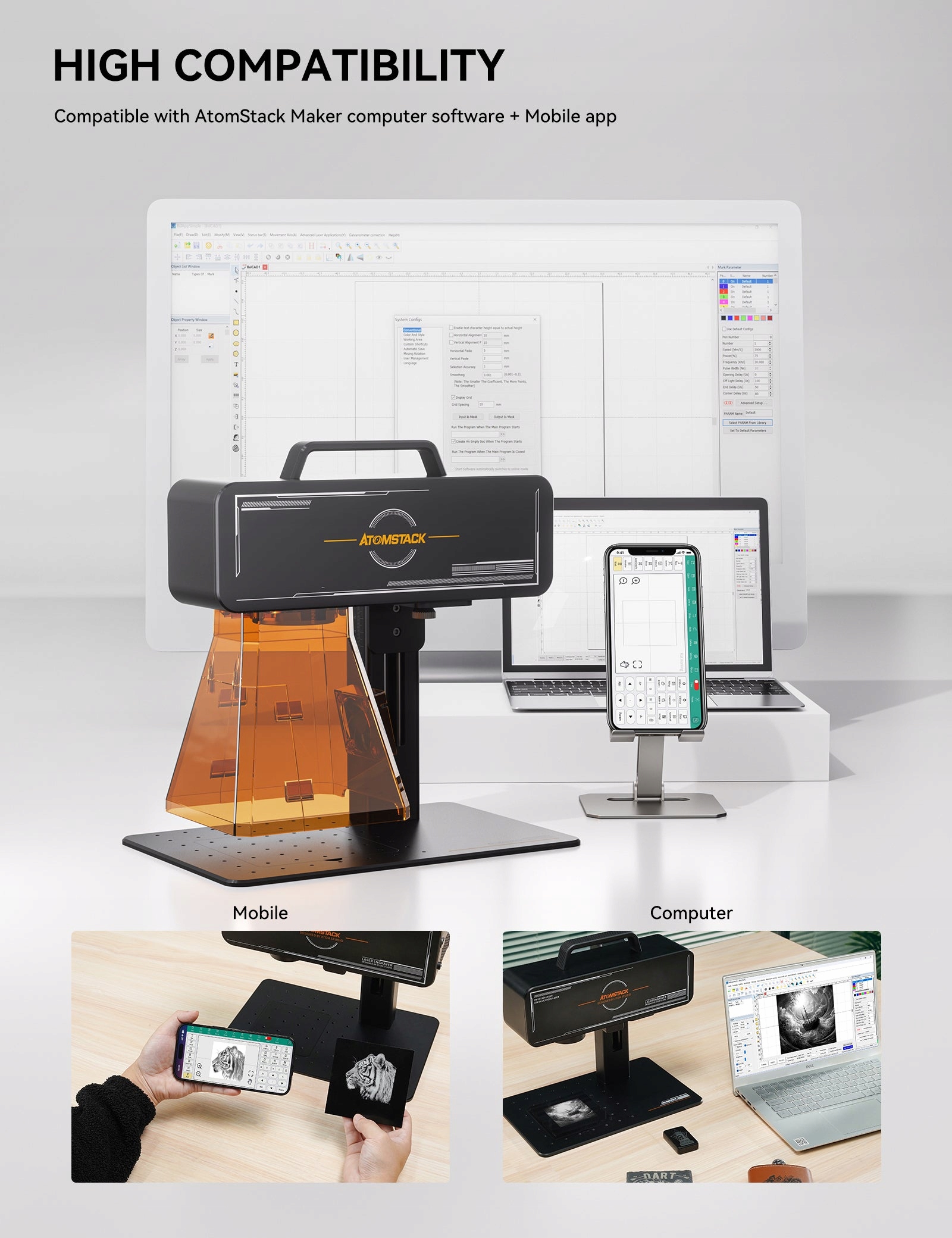 5. Высокая совместимость: предлагает бесплатное компьютерное программное обеспечение производителя Atomstack + мобильное приложение;