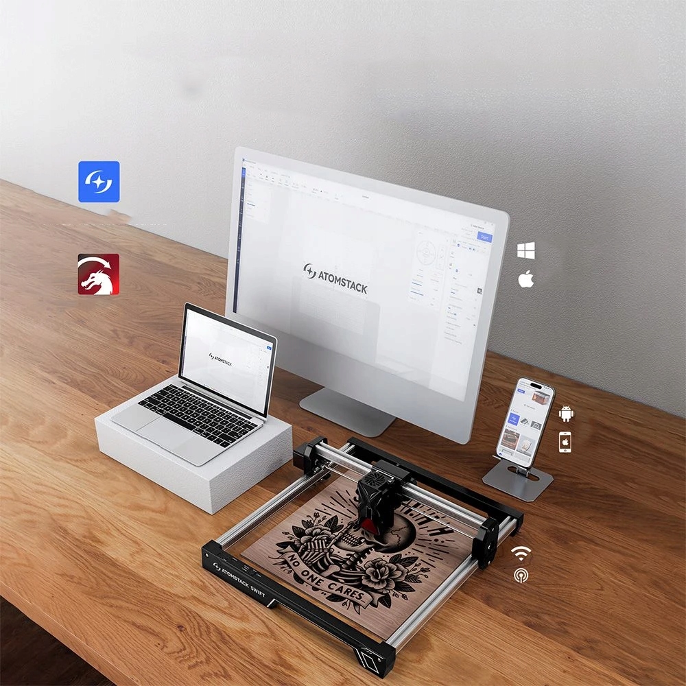 Гравировальное устройство поддерживает несколько платформ, включая Windows, macOS, Android и iOS. Он предлагает гибкие варианты подключения, такие как Wi-Fi, точку доступа и проводной USB, обеспечивая бесперебойную работу в любой среде. Пользователи могут управлять машиной через приложение AtomStack или использовать профессиональное программное обеспечение, такое как LightBurn, для расширенного управления дизайном и гравировкой.