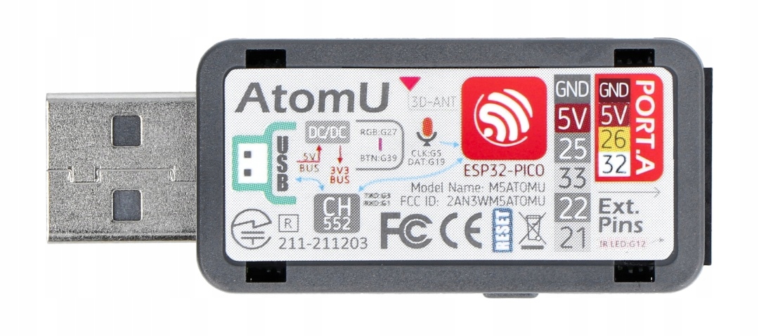 Модуль разработки от M5Stack — AtomU. Это модуль разработки для прототипирования и создания приложений Интернета вещей. Он оснащен двухъядерным микроконтроллером ESP32-PICO-D4 с беспроводной связью WiFi 2,4 ГГц. Модуль также оснащен цифровым микрофоном SPM1423 (I2S), обеспечивающим четкую запись звука.