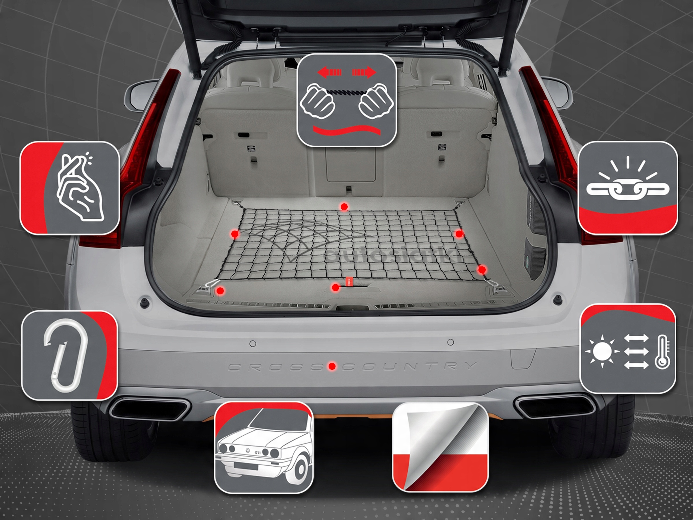 Сетка в багажник подходит как для мелких вещей, так и для нескольких крупных сумок для покупок. Постоянный размер ячеек (4,5 см) сетки для багажника позволяет удерживать мелкие продукты, а вплетенная по периметру резина обеспечивает широкие возможности регулировки. Благодаря этой сетке вы сохраните порядок в багажнике. Сетка защищает перевозимый багаж от перемещения даже при динамичной езде. Простая в использовании, сетка быстро становится незаменимым элементом багажника.