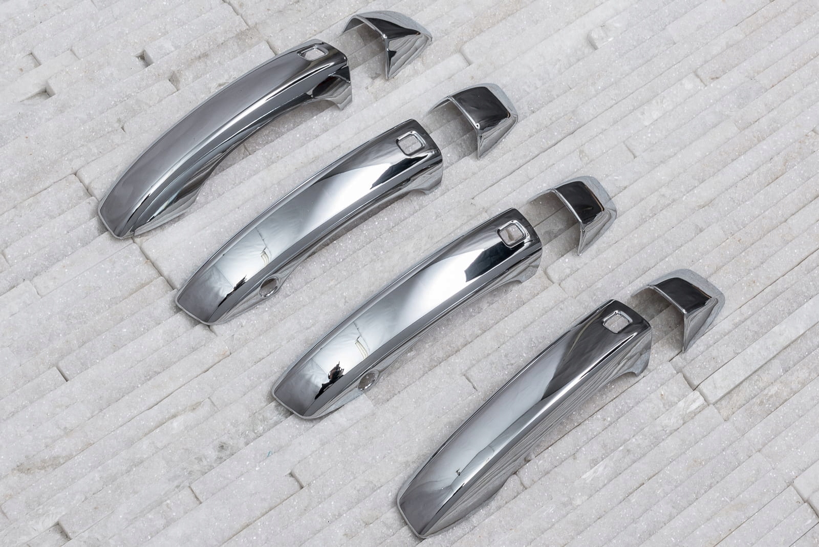 Декоративные хромированные накладки на дверные ручки — дополнение, дополняющее стиль автомобиля нотками спортивной элегантности. Идеально гармонируя с линиями автомобиля, они меняют облик дверных ручек модели А6, делая их настоящим украшением автомобиля. Изделие изготовлено из высококачественного хромированного АБС-пластика.