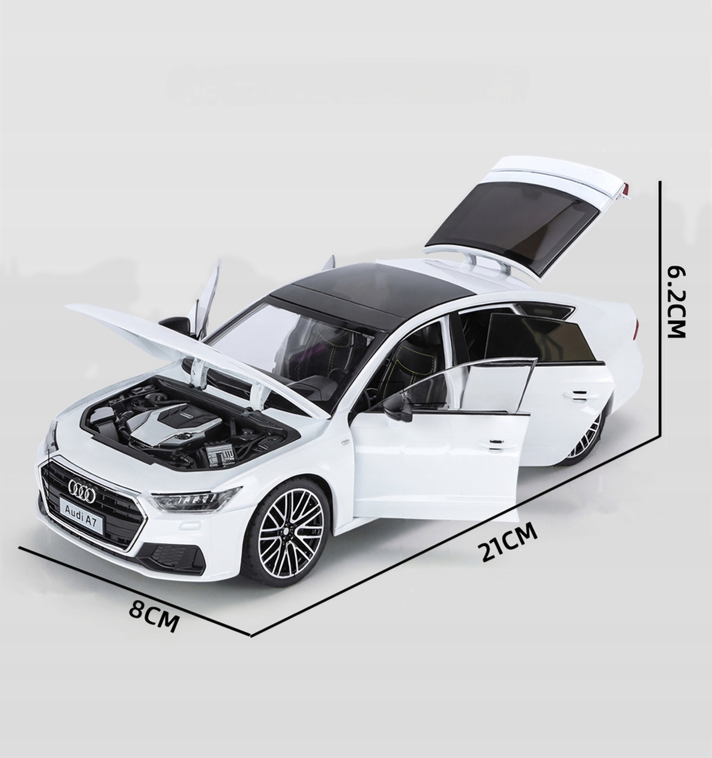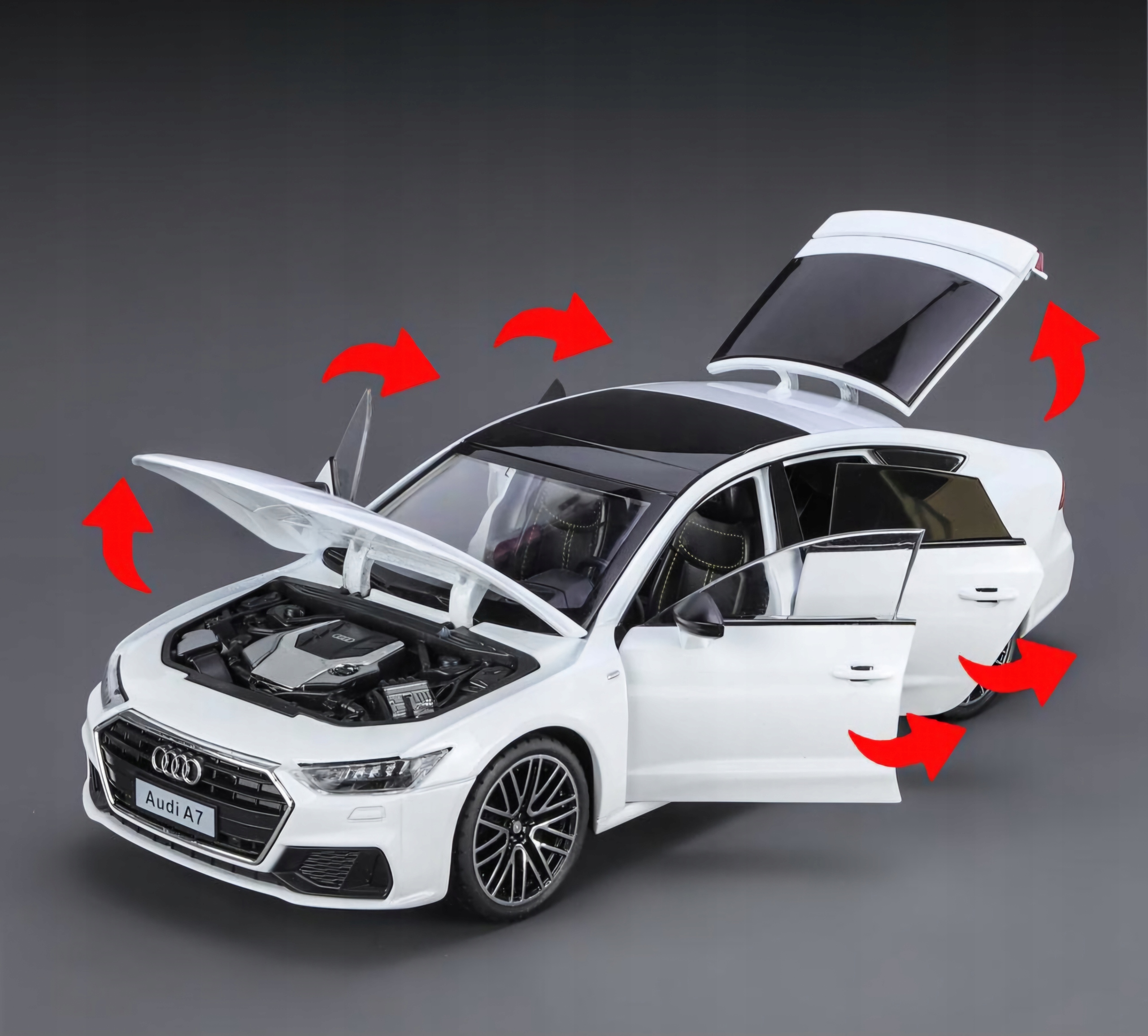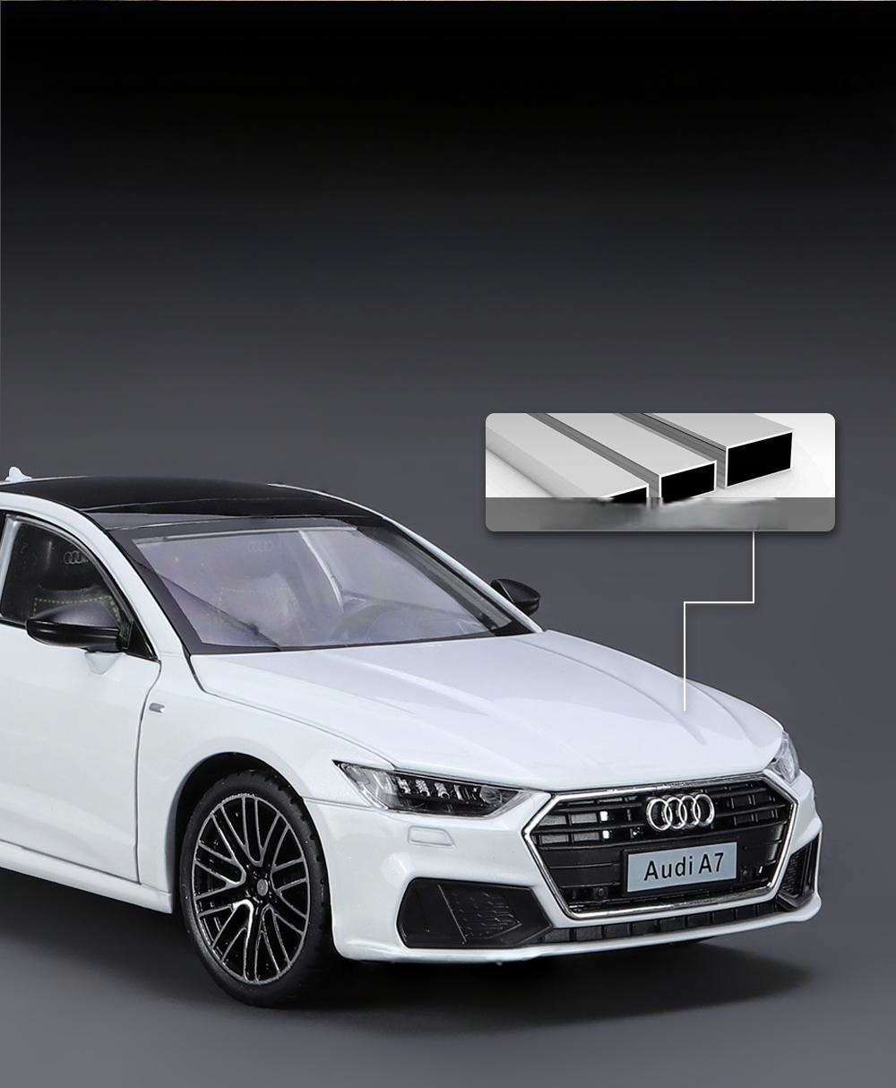 Модель Audi A7 выделяется точно воспроизводимые детали , которые привлекают даже самые требовательные. С всех сторон вы можете увидеть высочайшее качество отделки, от идеально гладкого лака, до тщательно спроектированного тела, до интерьера, который выглядит как настоящий.