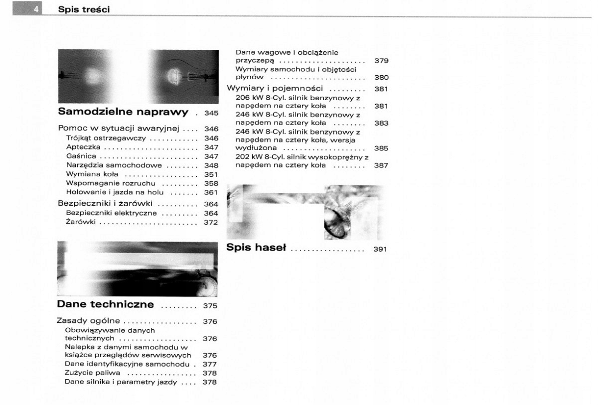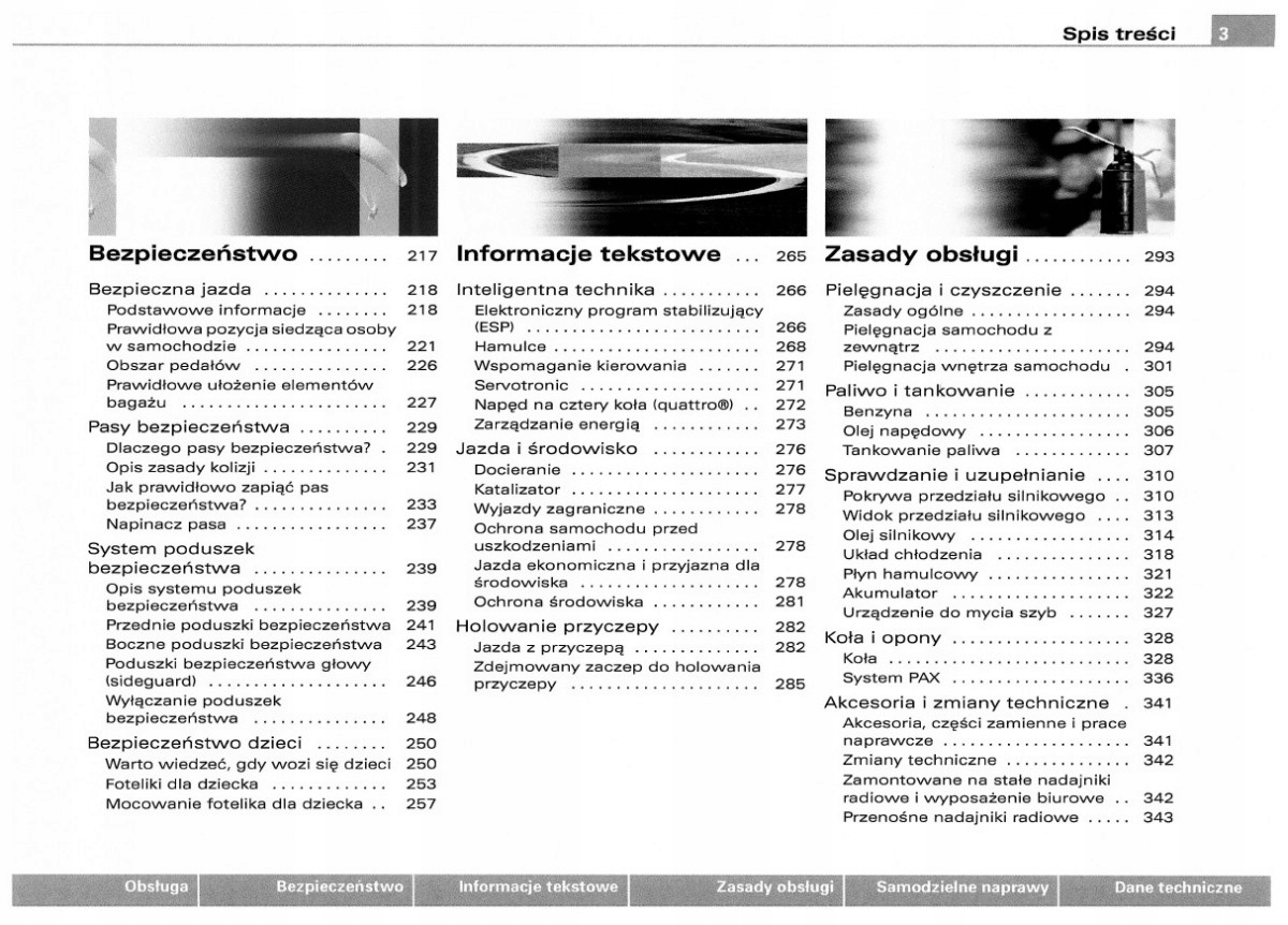 Руководство для владельца Audi содержит все версии оборудования и полезную информацию о том, как эффективно и безопасно использовать автомобиль, например. - индикаторы, контрольные лампы открытия и закрытия - освещение и обзорность, сиденья, отсеки для хранения вещей, отопление, вентиляция, кондиционер - советы по вождению, эксплуатации, обслуживанию автомобиля - уровни жидкостей, проверка и доливка, аварийные операции, замена колес, предохранителей, замена лампочек - технические данные... и многое другое, обеспечивающее ощущение безопасности и комфорта для путешественников. Польское законодательство обязывает продавца приложить к товару инструкцию по эксплуатации автомобиля на польском языке. Руководство пользователя автомобиля новое, на польском языке.