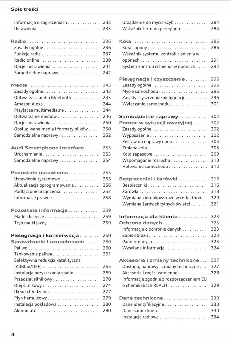 Руководство для владельца Audi содержит все версии оборудования и полезную информацию о том, как эффективно и безопасно использовать автомобиль, например: - указатели поворота, контрольные лампы, открывание и закрывание - освещение и обзорность, сиденья, отсеки для хранения вещей, отопление, вентиляция, кондиционирование воздуха. - советы по вождению, эксплуатации, обслуживанию автомобиля - уровни жидкостей, проверка и доливка, аварийные операции, замена колес, предохранителей, замена лампочек - технические данные... и многое другое, что дает путешественникам ощущение безопасности и комфорта.Польское законодательство обязывает продавца приложить к . Руководство пользователя автомобиля новое, на польском языке.