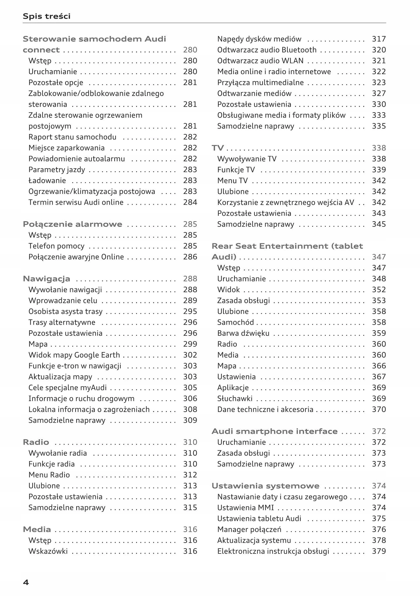 Руководство для владельца Audi содержит все версии оборудования и полезную информацию о том, как эффективно и безопасно использовать автомобиль, например: - указатели поворота, контрольные лампы, открывание и закрывание - освещение и обзорность, сиденья, отсеки для хранения вещей, отопление, вентиляция, кондиционирование воздуха. - советы по вождению, эксплуатации, обслуживанию автомобиля - уровни жидкостей, проверка и доливка, аварийные операции, замена колес, предохранителей, замена лампочек - технические данные... и многое другое, что дает путешественникам ощущение безопасности и комфорта.Польское законодательство обязывает продавца приложить к . Руководство пользователя автомобиля новое, на польском языке.