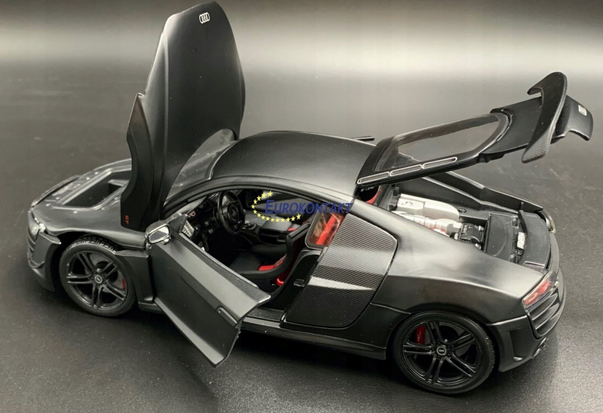 Модель автомобиля Audi отличается вниманием к деталям. Имеет подвижные элементы – двери, колеса, крышку двигателя, капот. Точно воспроизведенные детали – в том числе и в моторном отсеке.
