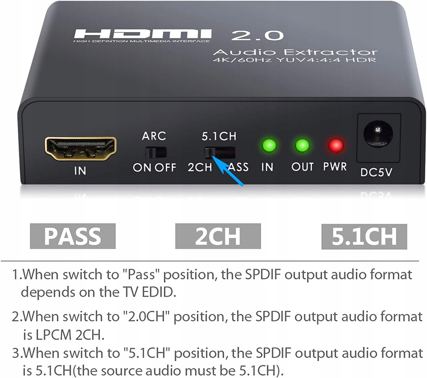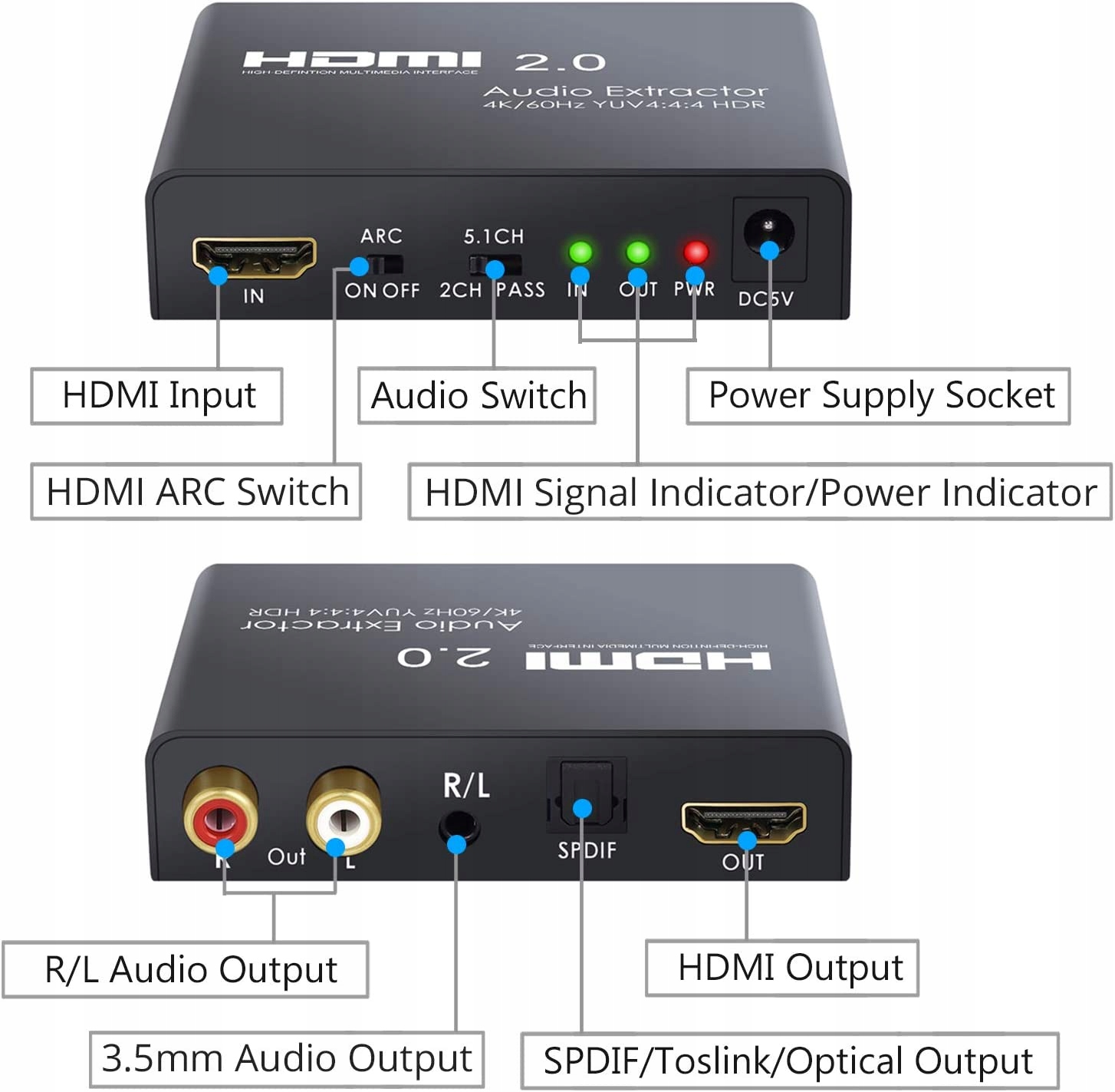 HDMI 2.0 Audio Extractor, извлекая аудио -сигнал HDMI с аудио -вывода HDMI. (Примечание: это устройство может передавать только аудио форматы Dolby Digital/DTS и декодирует эти форматы, чтобы не быть аналоговым выводом. Если вы используете аналоговый вывод, убедитесь, что источник HDMI установлен на Audio PCM.)