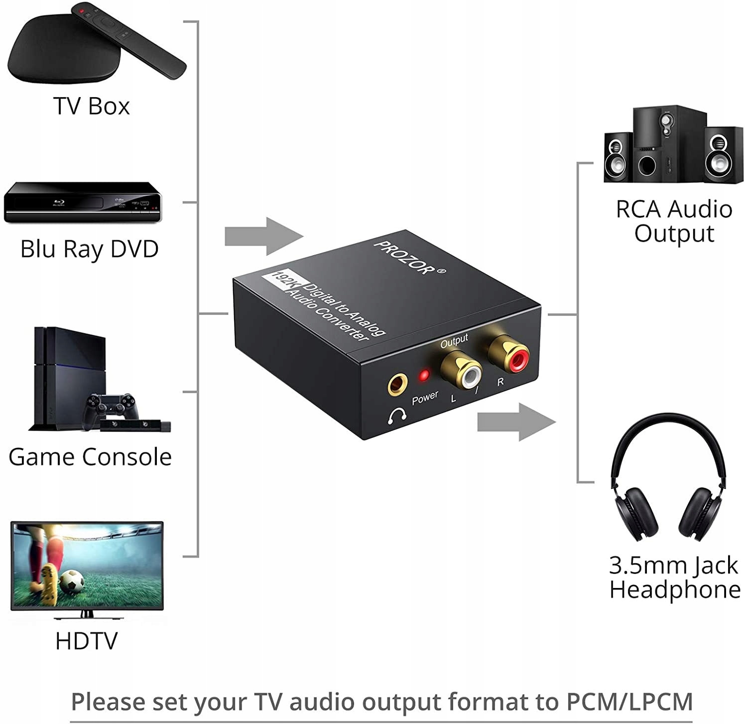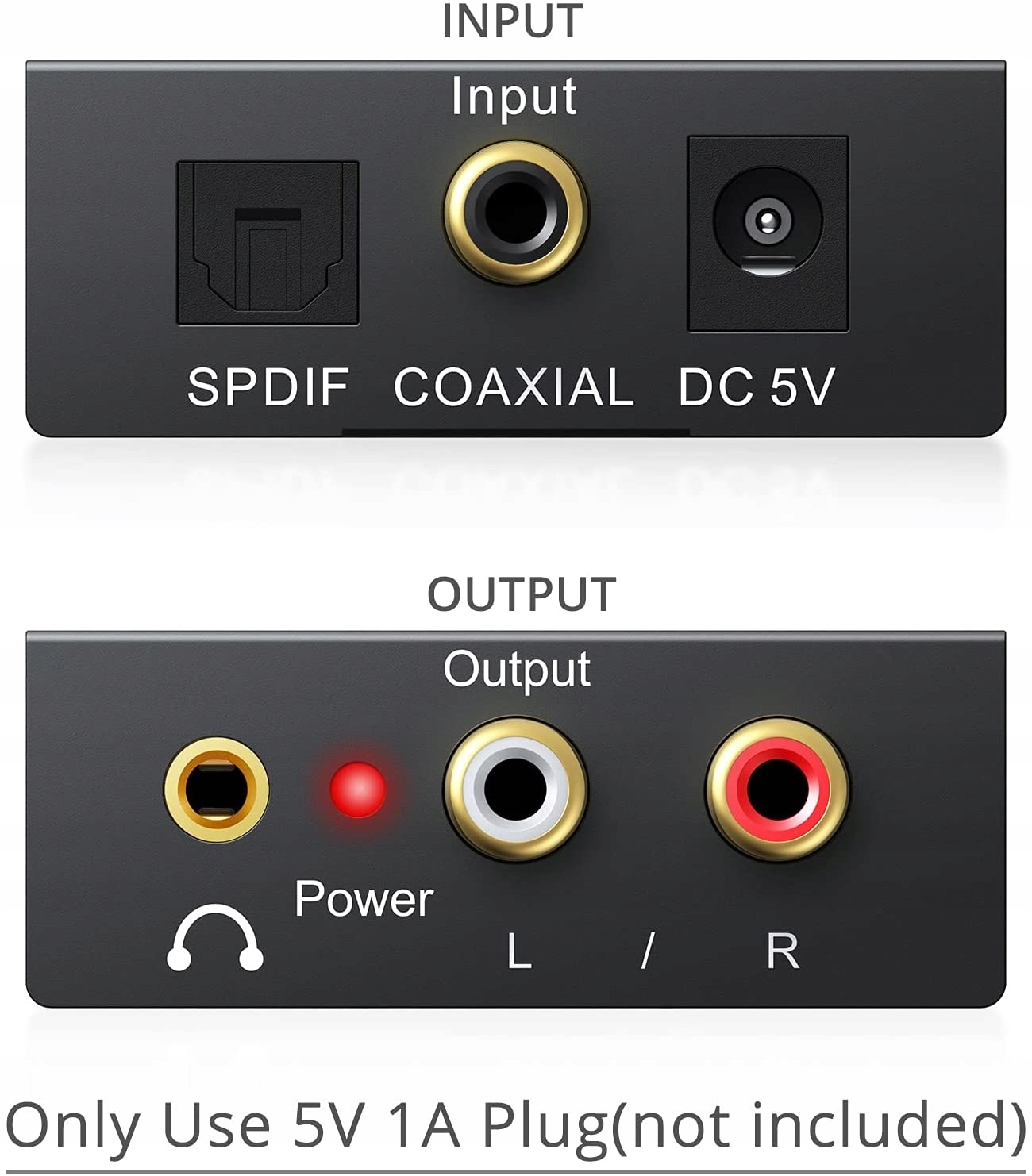 Разъем аудиовхода: 1 x Toslink, 1 x RCA (коаксиальный); Разъем аудиовыхода: 2 x RCA (правый/левый), 1 x 3,5 мм Jack; Питание от кабеля питания USB диаметром 5,5 мм (адаптер питания в комплект не входит); Не используйте другие вилки, можно использовать только вилку 5 В, 1 А