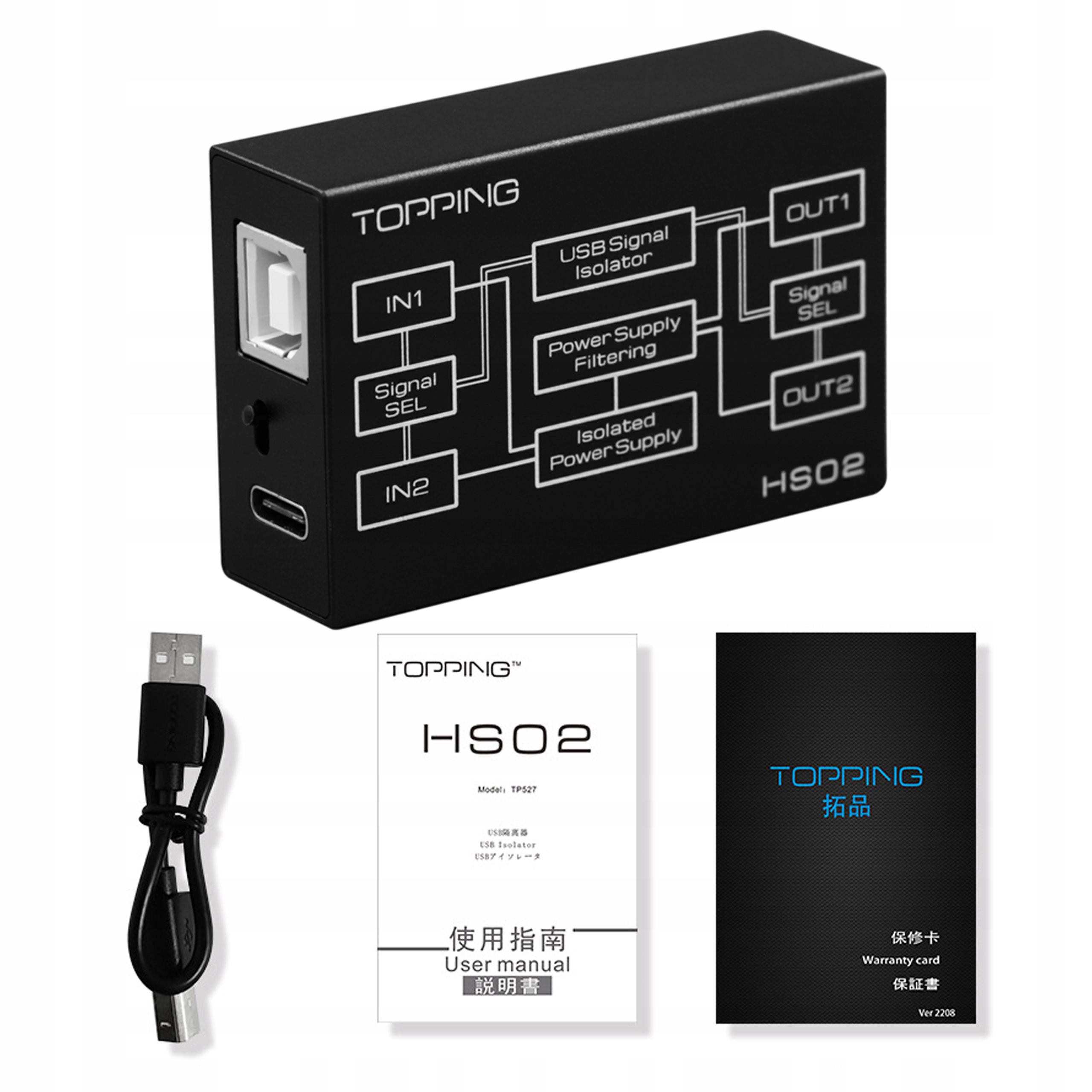 HS02 оснащен двумя входными интерфейсами (USB-B и USB-C) и два выходных интерфейса (USB-A и USB-C), между которыми можно переключаться.