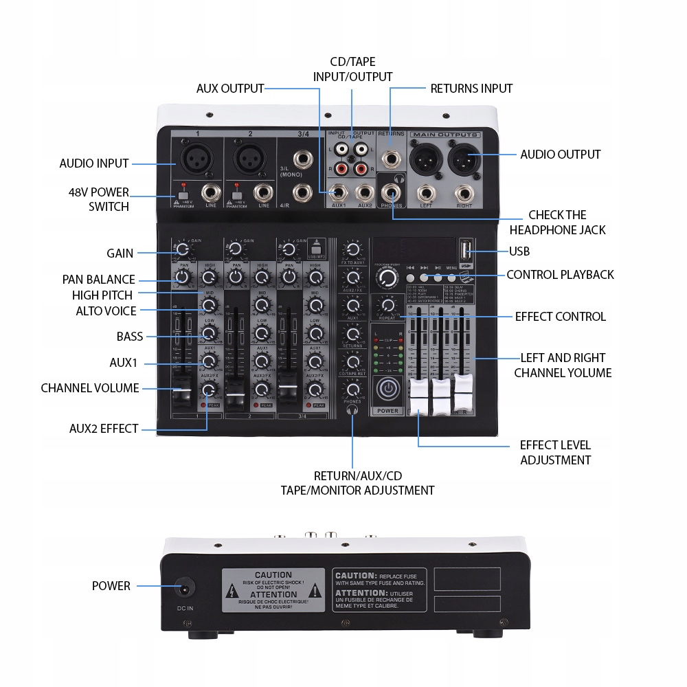 4. 【Высокое качество звука】: благодаря независимому фантомному источнику питания 48 В+ этот микшер поддерживает конденсаторные и динамические микрофоны. Сверхнизкий уровень шумовых искажений позволяет использовать микшер с конденсаторными микрофонами, улавливая тонкие различия в вокале и инструментах с высоким разрешением.