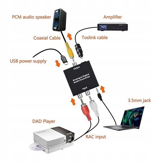 преобразование сигнала очень просто - просто подключите устройство к гнездам AUX 3,5 мм или до двух разъемов RCA R/L. Более того, наш конвертер поддерживает SPDIF, Toslink, оптические и коаксиальные цифровые выходы. Помните, что это устройство позволяет вам преобразовать аналоговые сигналы в цифровые данные - оно не работает в противоположном направлении!