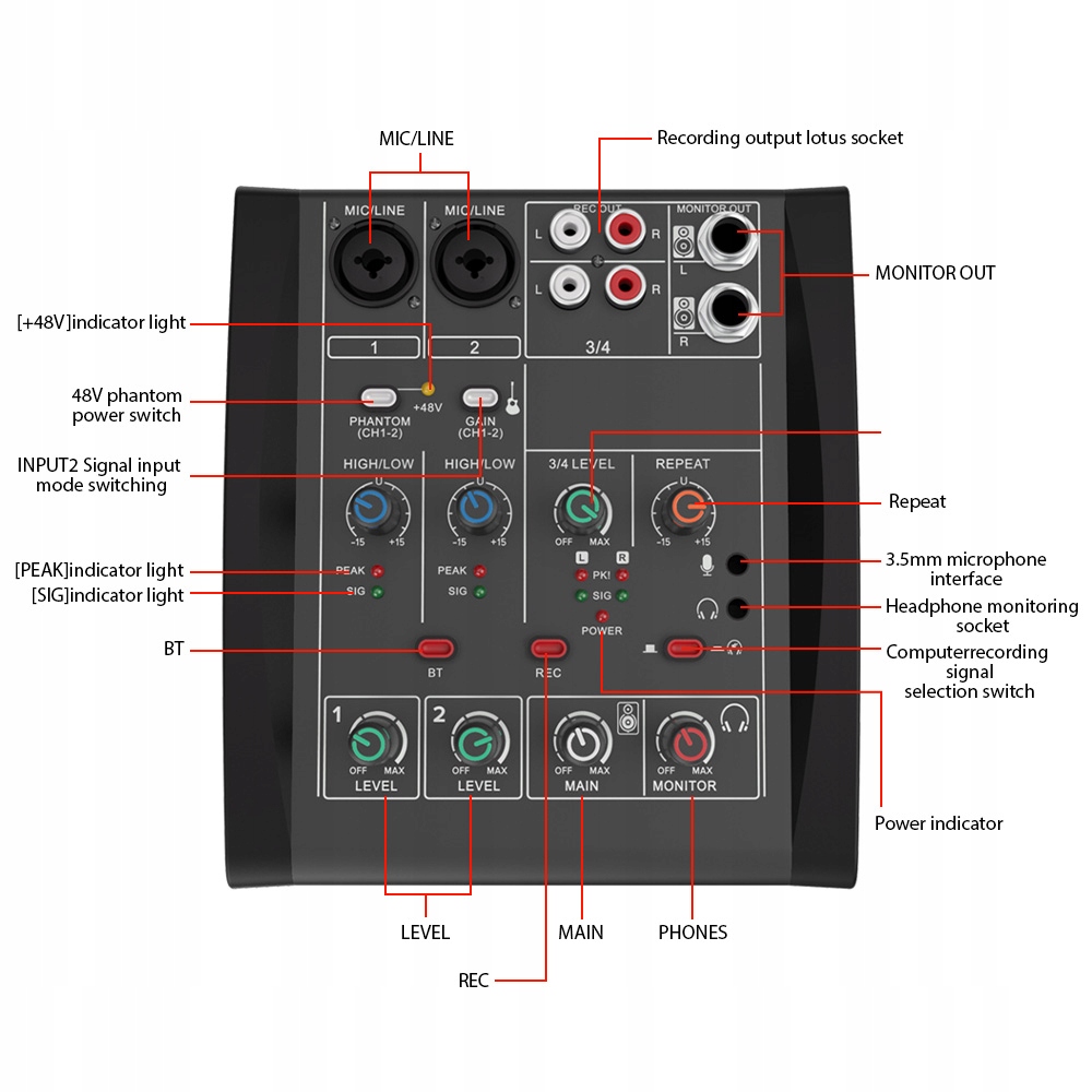 1. 【Универсальное соединение】: этот 4-канальный аудио микшер разумно разработан для совместимости с рядом устройств, включая наушники, усилители, гитары, компьютеры и электронные клавиатуры. Независимо от того, записываете ли вы на своем компьютере, захватываете гитарные песни или выступаете вживую, этот микшер предлагает проблемы с проблемами для всех потребностей звука.