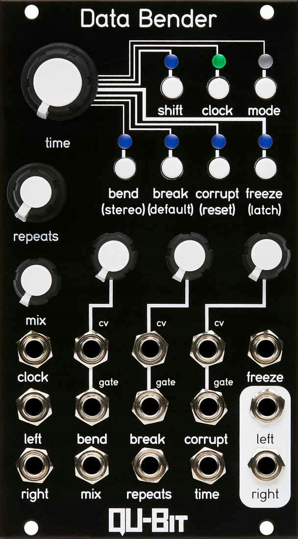 Прервать звуковой сигнал. QU-Bit Data Bender — это цифровой аудиобуфер с круговыми изгибами. Вдохновленный звуком сбоя аудиооборудования, Data Bender издает звуки пропуска компакт-диска, ошибок программного обеспечения и сбоя воспроизведения ленты. Аудиобуфер может хранить до пяти минут стереозвука, создавая звуковое полотно, способное преподнести звуковые сюрпризы.