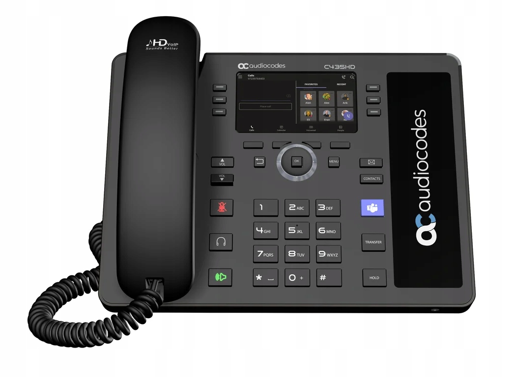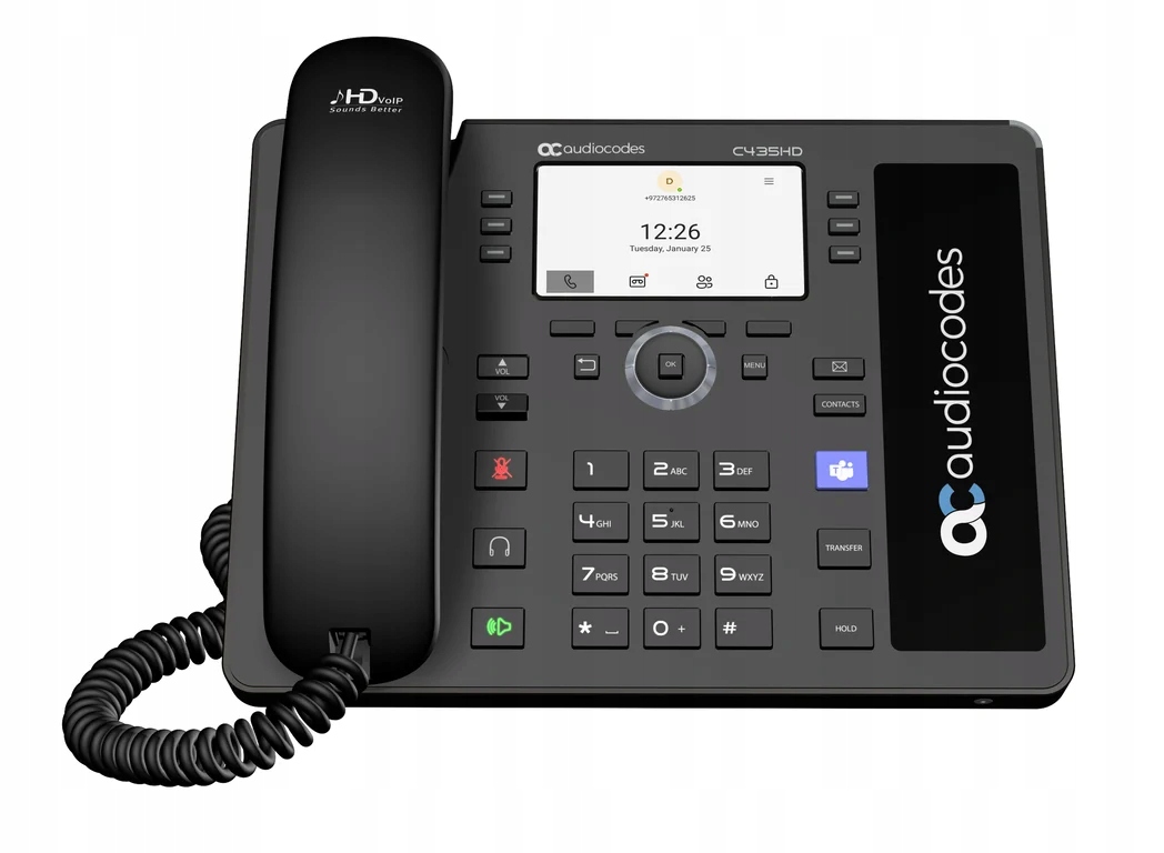 Audiocodes C435HD. Тип продукта: IP Phone, Цвет продукта: черные, наушники Тип: набор проводных наушников. Установленная операционная система: Android, двойные многочастотные (DTMF) Режимы: Информация SIP. Регулировка громкости: кнопки. Тип экрана: LCD, Диагональная длина экрана: 10,9 см (4,3 "). Голосовые кодеки: G.711, G.722, G.729, jedwab