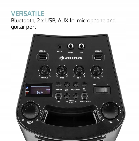 Bluetooth-колонка auna PPS 35 предлагает высочайшее качество звука для любителей музыки и артистов. В комплект входят встроенный сабвуфер диаметром 14 см (5,5 дюйма) и два среднечастотных/высокочастотных динамика диаметром 4,5 см (1,7 дюйма) общей среднеквадратичной мощностью 40 Вт, а также возможность легкого подключения различных источников звука. Имеются два встроенных USB-порта с поддержкой MP3 для воспроизведения музыки с USB-накопителей, интерфейс Bluetooth для беспроводного подключения к MP3-плеерам или смартфонам, вход AUX для подключения домашних стереосистем и гитарный вход. Радиолюбители могут использовать FM-тюнер для приема местных радиостанций. Вы можете добиться индивидуального звучания, используя отдельные регуляторы высоких частот, низких частот и эха.