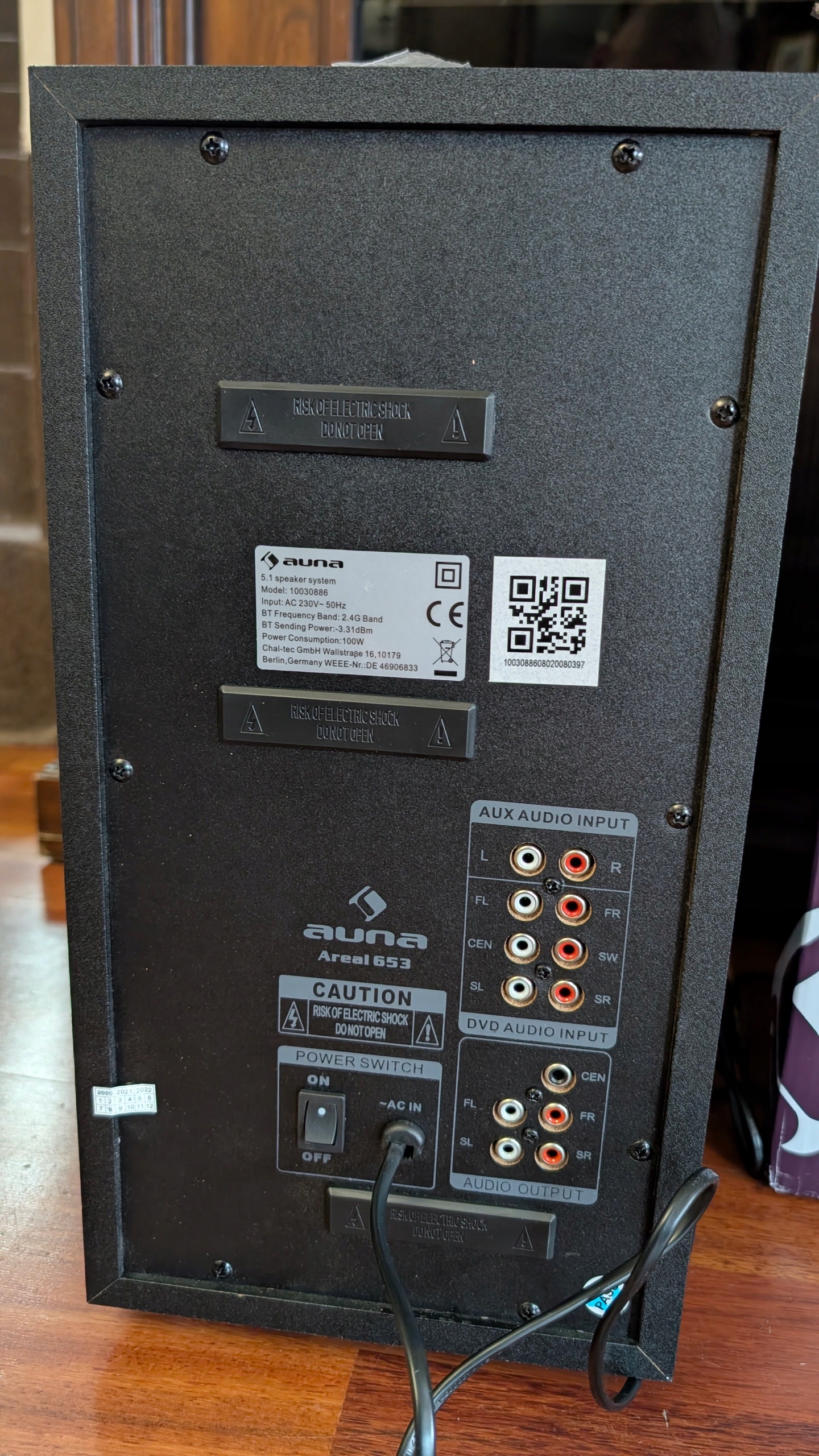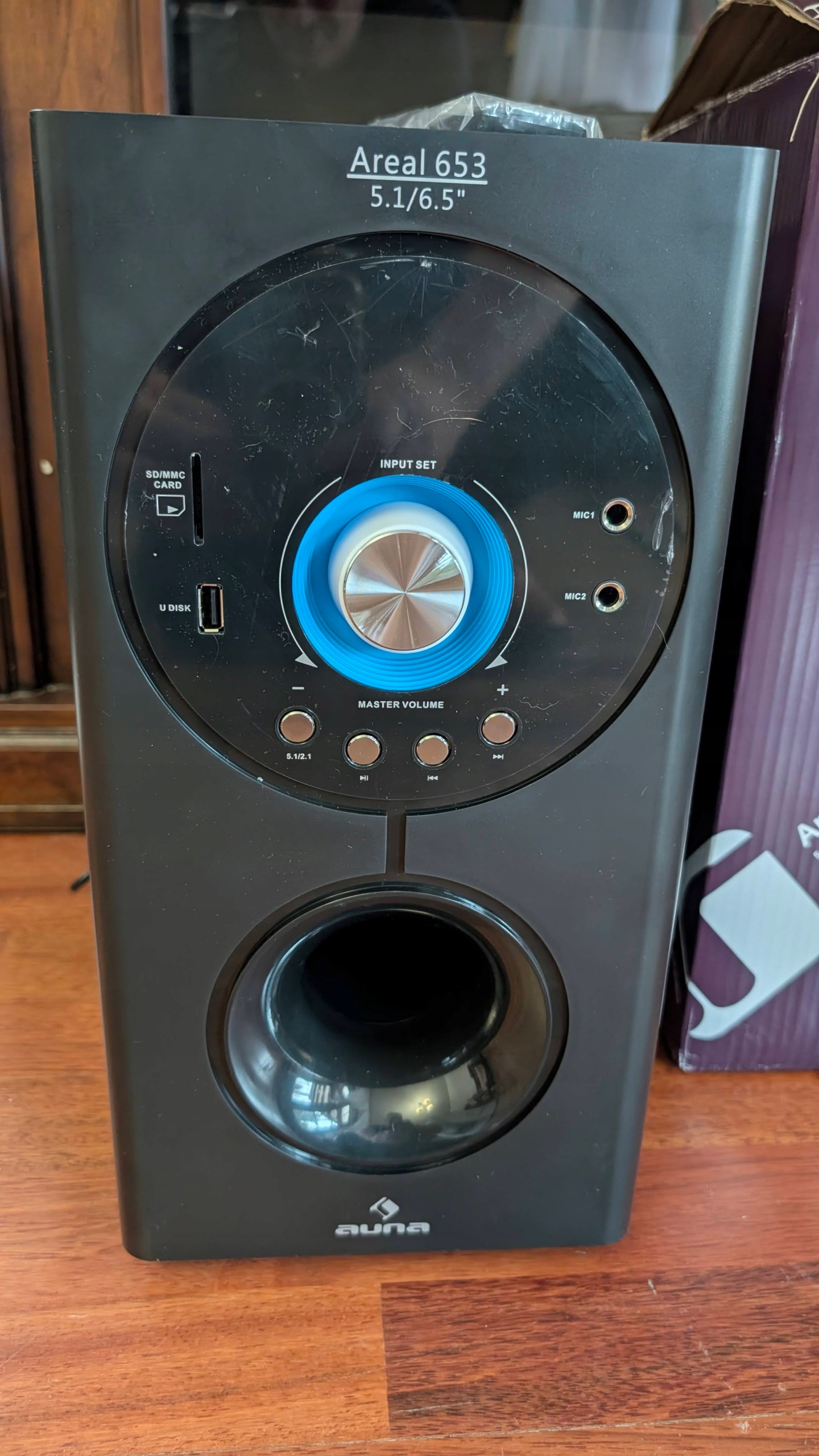 - Соединения сабвуфера: 1 x usb -порт, 1 x sd -слот для карты памяти, 2 x гнездо 6,3 мм вход микрофона, 1 x aux stereo вход, 1 x x chind gulque 5.1 ввод динамика, 1 X CINCH SURRUND 5.1 Выход громкоговорителя