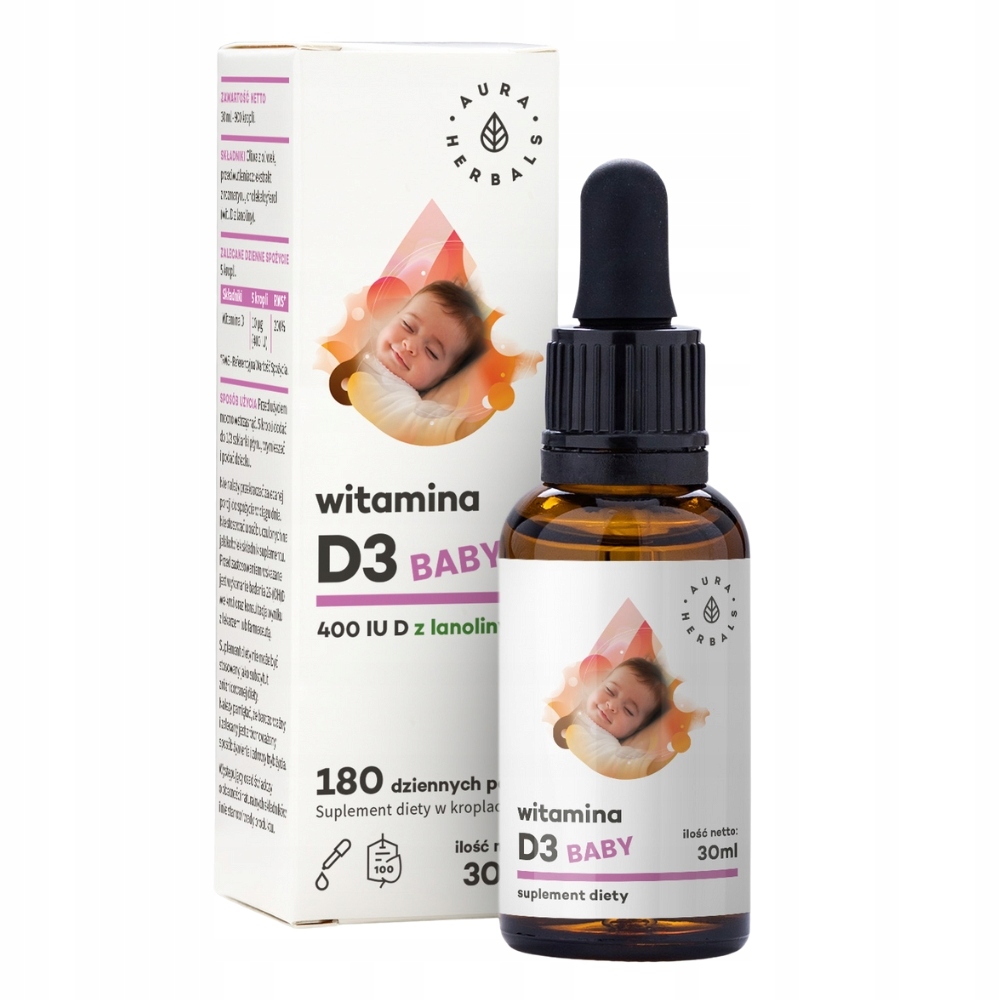 AURA HERBALS Витамин D3 — биологически активная добавка в форме капель, созданная специально для младенцев и детей до 3 лет. Благодаря жидкой форме витамин можно легко и безопасно давать ребенку. Препарат содержит натуральный витамин D3, полученный из ланолина, его состав краток и безопасен. Витамин D3 поддерживает правильное развитие костей, их минерализацию и плотность, а также регулирует кальциевый и фосфатный обмен. Кроме того, он укрепляет иммунитет, поддерживает работу мышц и здоровье зубов. Соответствующий его уровень снижает риск развития рахита и остеомаляции у детей.