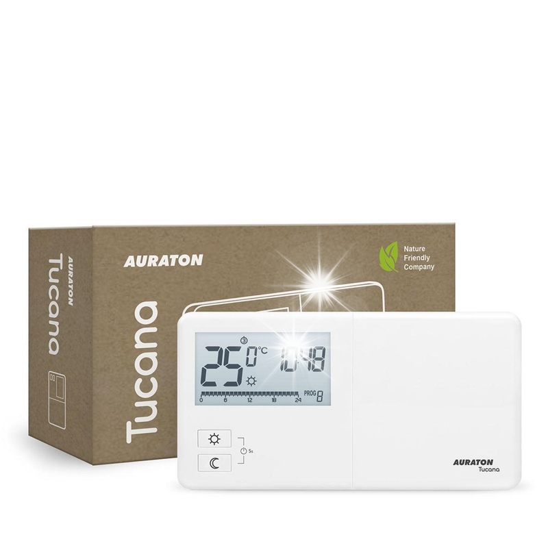 aaarton tucana b> позволяет пользователю управлять 7 независимыми настраиваемыми программами, при 4 независимо устанавливая температуры: дневное время, ночь, антикриминальные, отпуск. ЖК -дисплей имеет 3 цвета подсветки на выбор и адаптирован для работы в плохо освещенных комнатах. Еженедельный, температурный лайнер также имеет счетчик времени нагревательного устройства. Регулятор оснащен режимом работы ШИМ, состоящий из циклического переключения и отключения нагревательного устройства, сводя к минимуму колебания температуры. Алгоритм ШИМ поддерживает тепловой комфорт в комнате, опередив поведение системы отопления, при этом заботясь о минимальной энергии.
