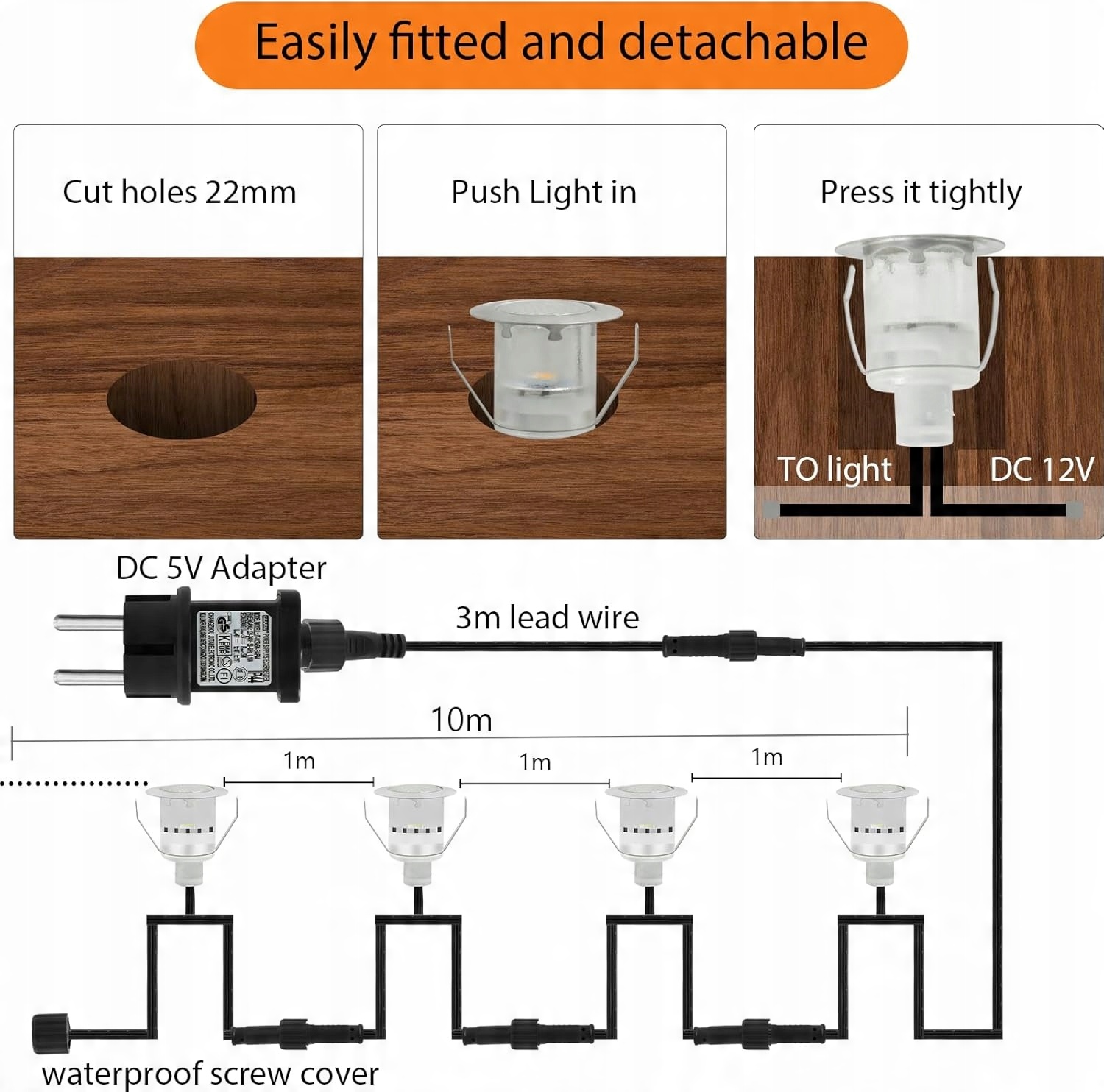 Мы подтвердим проблему с продуктом и заменим вам новый продукт. Универсальность – встраиваемые точечные светильники являются хорошим выбором для подъездов, коридоров и лестниц. Его также можно установить на террасе (композиты, дерево, бетон, плитка...), прихожей, клумбе или непосредственно на стене или потолке дома. Энергосбережение: встроенный светодиодный чип 2835SMD. Срок службы более 50 000 часов, низкое напряжение 5 В, энергосбережение и экологичность. 【Легко собирать и разбирать】Используйте режущий инструмент, чтобы вырезать круглое отверстие диаметром 22 см, где требуется установка. Интегрируйте светодиодные мостовые фонари, а затем подключите все кабели. Лампы для патио, состоящие из 10 частей, являются съемными и подключаются параллельно. Блок питания входит в комплект и может быть легко установлен без каких-либо дополнительных аксессуаров. Встроенные светильники для патио: светодиодные фонари изготовлены из высококачественного акрила/АБС-пластика и нержавеющей стали 304, корпус светильника для патио полностью изолирован и водонепроницаем по стандарту IP67. Может быть установлен на лестницах моста, ступеньках моста, террасах, полах, карнизах, лестницах, проходах, кухнях, светодиодном ландшафтном освещении наружного сада, внутренней и наружной отделке. Комплекты встраиваемых светильников устойчивы к погодным условиям.