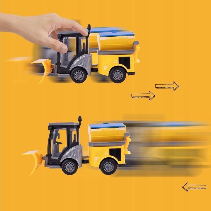 Снегоочиститель имеет резиновые колеса и фрикционный привод. Просто толкните его вперед или назад, и он проедет несколько метров по прямой. Продолжительность поездки зависит от скорости.