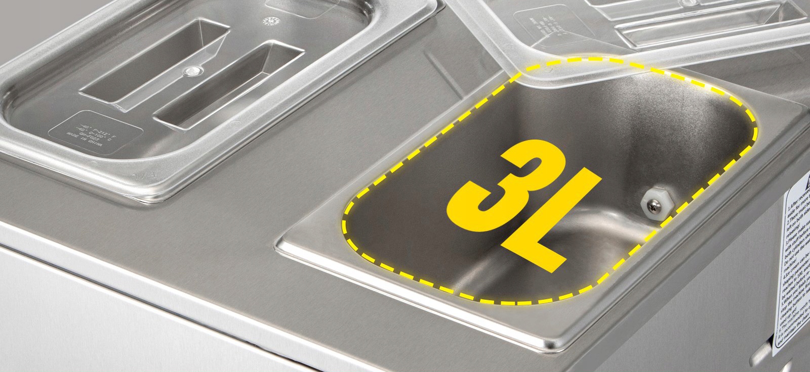Оснащенный двумя бункерами емкостью 3 л (0,8 галлона) каждый, он обеспечивает впечатляющую производительность до 18 л/ч.