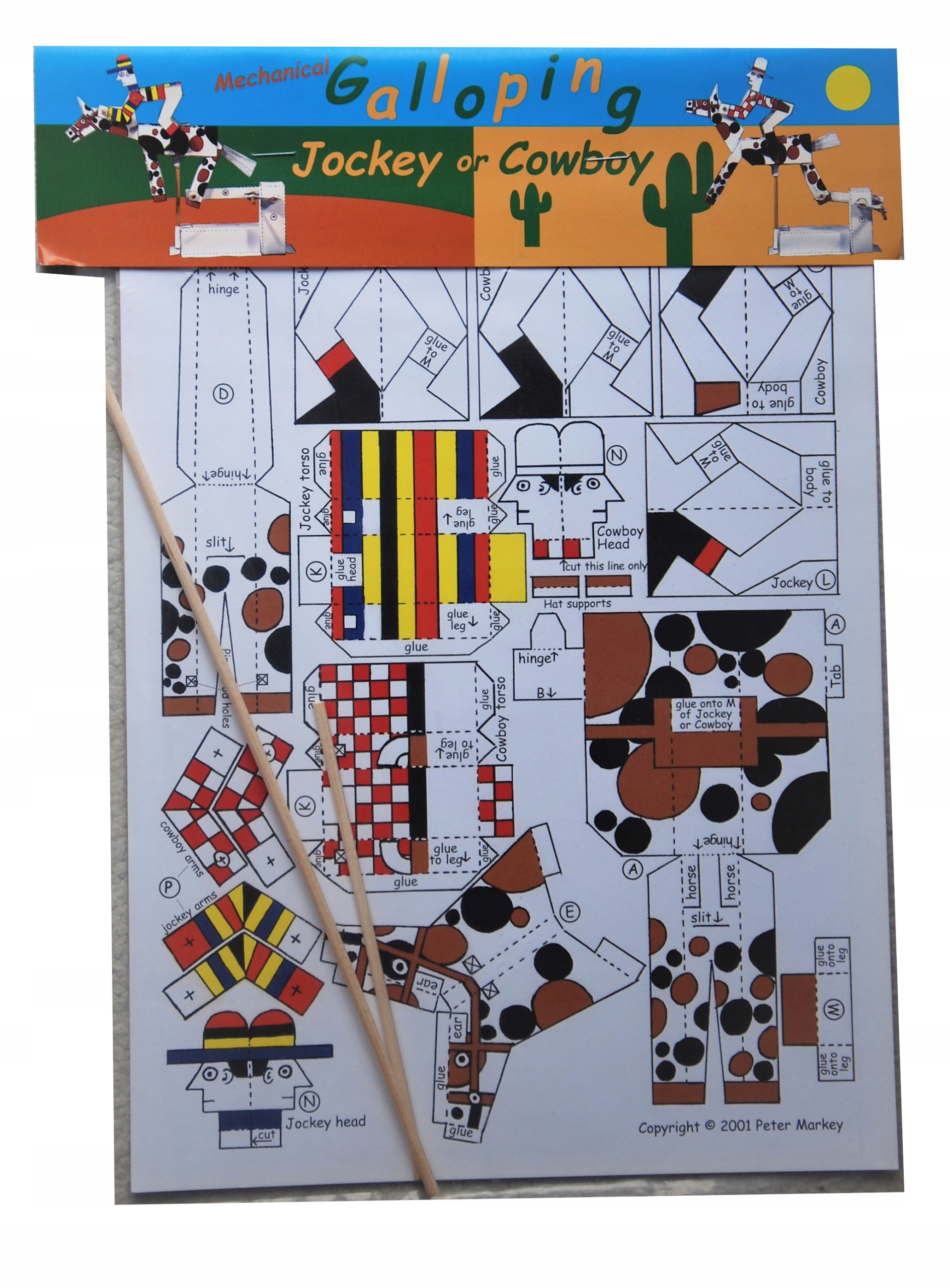 Набор состоит из двух картонных листов, из которых можно вырезать детали, необходимые для сборки, и склеить бумажные, подвижные фигурки. . Помимо вашего энтузиазма и терпения, вам также понадобятся ножницы, острый нож, клей и кусок ленты, чтобы создать потрясающую копию оригинальной движущейся скульптуры Питера Марки.