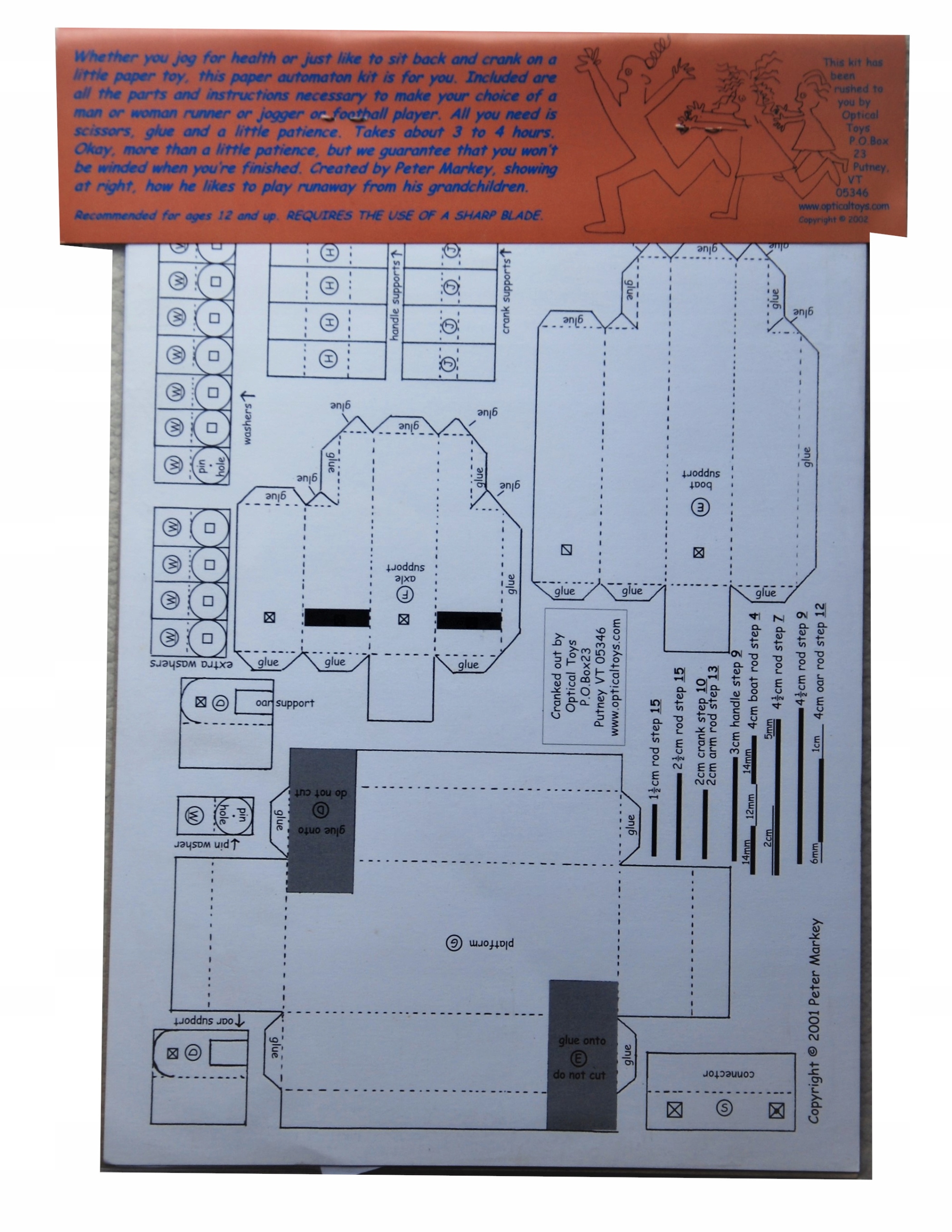 Набор состоит из двух картонных листов, из которых можно вырезать детали, необходимые для сборки, и склеить бумажные, подвижные фигурки. . Помимо вашего энтузиазма и терпения, вам также понадобятся ножницы, острый нож, клей и кусок ленты, чтобы создать потрясающую копию оригинальной движущейся скульптуры Питера Марки.