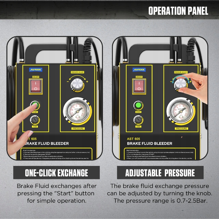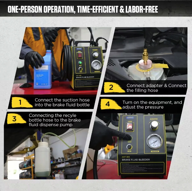 AST605 — устройство для замены тормозной жидкости. Физический принцип заключается в заборе тормозной жидкости из нового бачка с помощью насоса и непрерывной закачке ее в бачок тормозной жидкости автомобиля под определенным давлением. По сравнению с традиционным методом замены тормозной жидкости путем сжатия этот пульсирующий теплообменник тормозной жидкости эффективно предотвращает образование пузырьков воздуха в процессе заливки, что позволяет избежать утомительного процесса прокачки вручную.