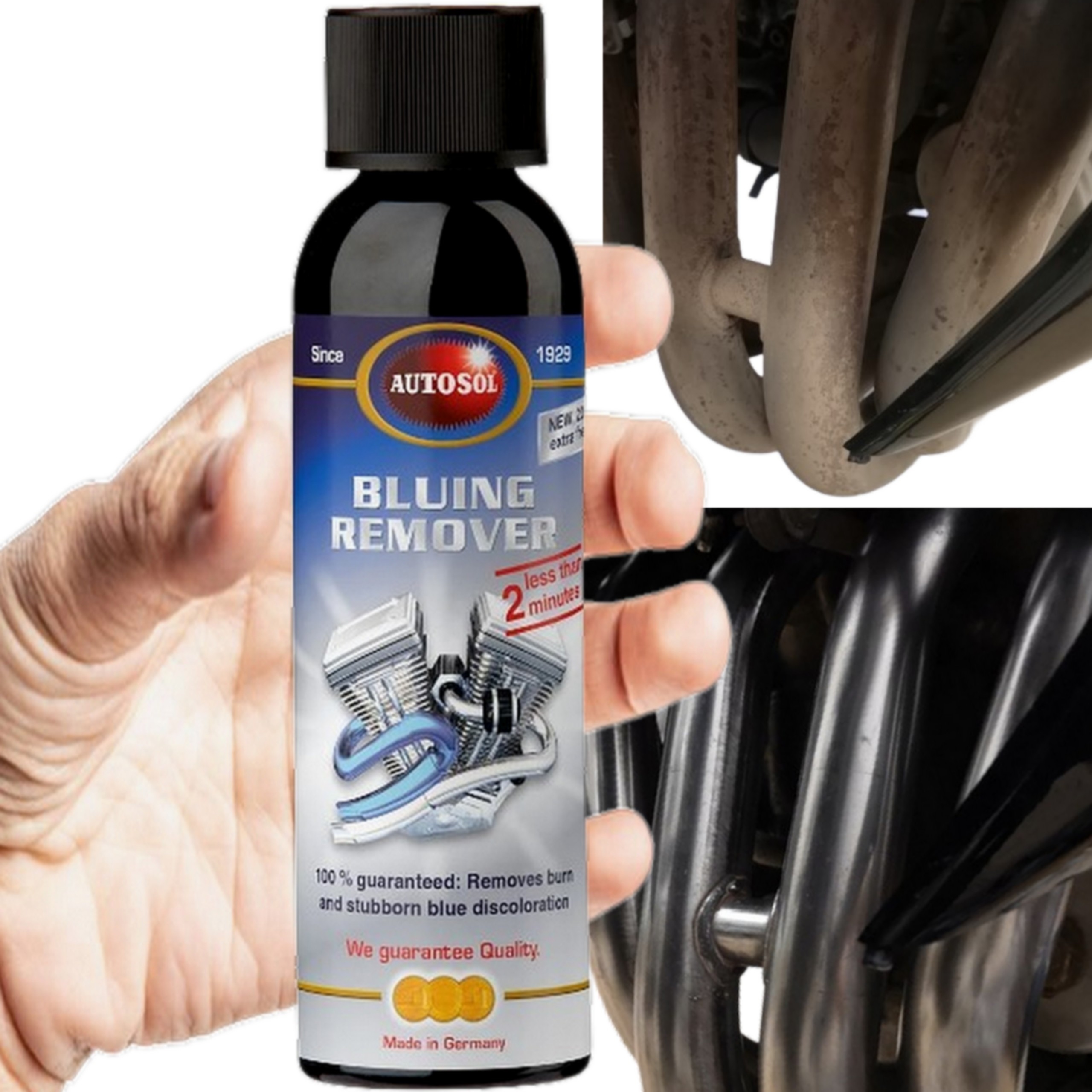< b >AUTOSOL BLUING REMOVER – комбинация химически активных веществ с полировальными и абразивными составами. Он даже удаляет интенсивную синюю окраску выхлопных труб из нержавеющей стали, возвращая им серебристый блеск.