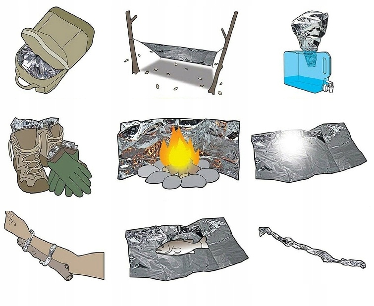 - Изготовлено из высококачественной фольги, используемой в спасательных операциях, туризме и альпинизме, а также в чрезвычайных ситуациях или экстремальных условиях.