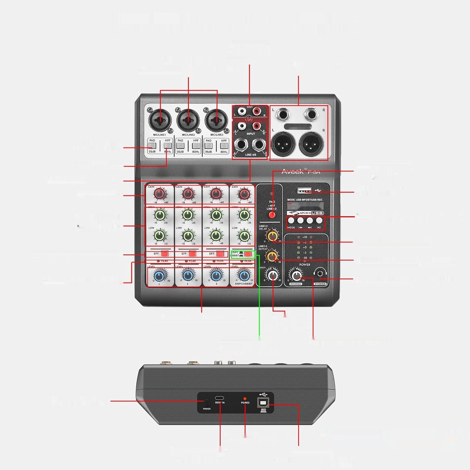Профессиональный 5-канальный DJ-микшер 5-канальный контроллер аудиоинтерфейса DJ-микшера Aveek представляет собой идеальное сочетание для микширования звука с MP3, микрофона, инструментов, устройств USB и Bluetooth. Он идеально подходит для качественных сценических выступлений, живых выступлений и караоке.