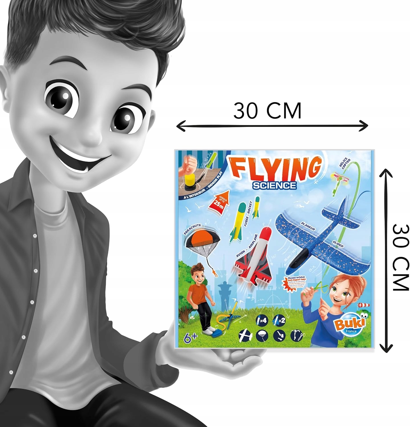 Flying Science — набор, содержащий ракеты, самолеты, планеры, парашюты и другие игрушки, которые можно опробовать в полете. Развлечение заключается в подключении выбранной машины к ножному насосу, который при запуске поднимется на высоту до 25 метров! Вы можете установить пусковую установку под разными углами и попытаться выстрелить в машину как можно выше. В зависимости от давления ноги на насос игрушка поднимется на определенную высоту и наберет определенную скорость.