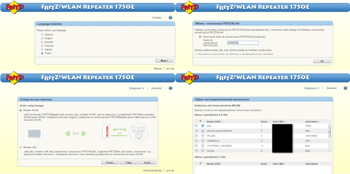 - Конфигурация через браузер (http://fritz.repeater)