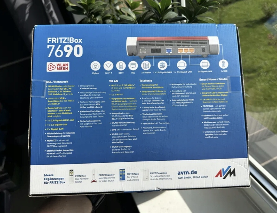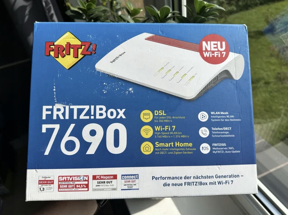 Здравствуйте. Продаю двухдиапазонный маршрутизатор AVM FritzBox 7690 WiFi 7 5760 Мбит/с 3xRJ45 2xRJ11.