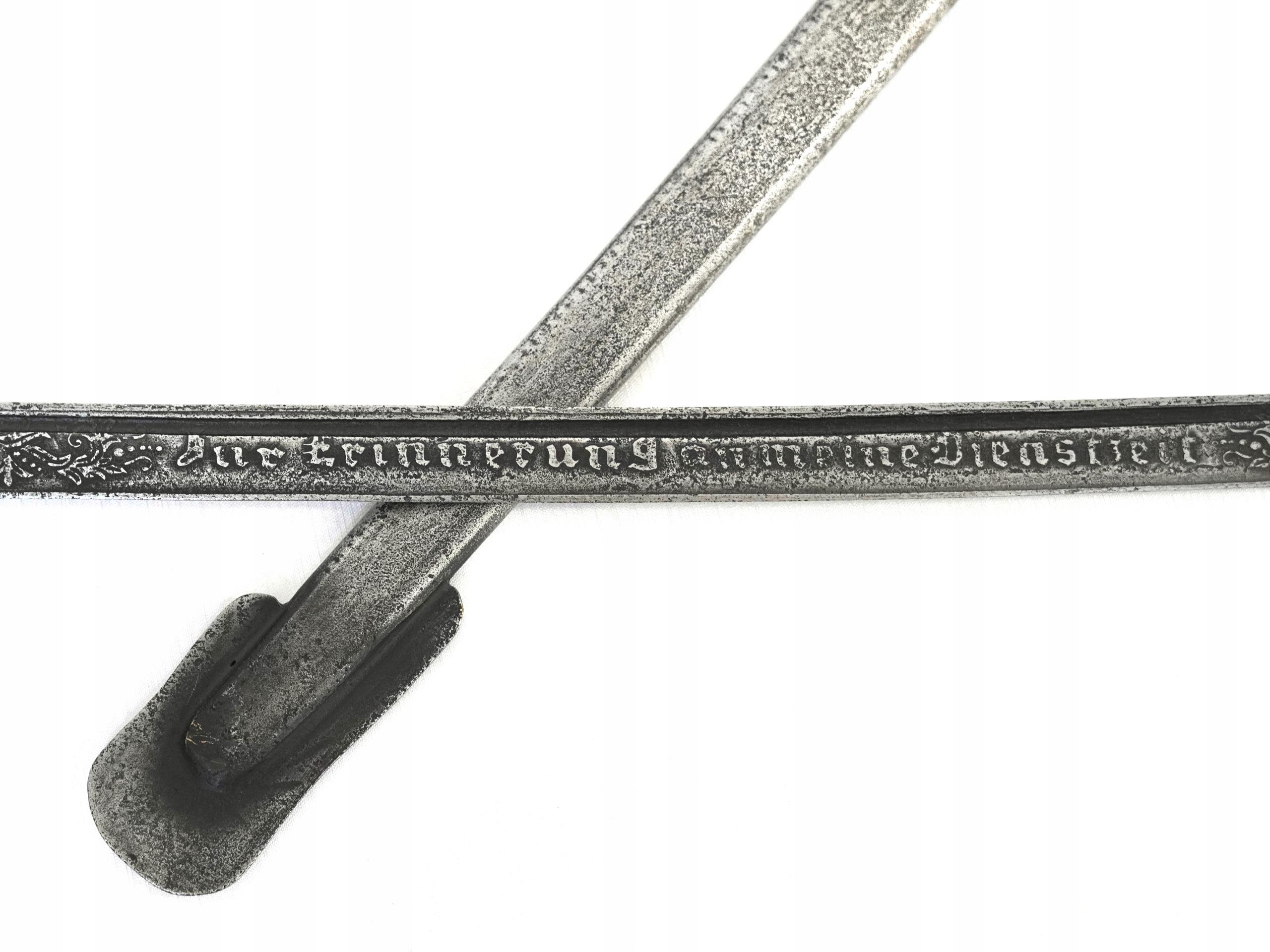 Представляемая нами сабля подписана в месте соединения клинка с рукояткой. Там маркировка завода Е.у.Ф. ХОРСТЕР ЗОЛИНГЕН. Лезвие изготовлено из высококачественной незакаленной стали. На «усах» с одной стороны буквы К и Р в короне, а с другой — скрещенные пушки. На сабле с правой стороны головного убора имеется надпись «Zur Erinnerung an meine Dienstzeit», что в переводе с немецкого означает «В память о моей службе». Там же присутствует растительный узор. Ручка деревянная, с поперечным насечком, обтянута натуральной кожей, латунная оплетка. Колпачок на конце ручки в форме головы льва, глаза которого украшены красными камнями, имитирующими рубин. Лук изготовлен из латуни, красиво украшен растительными мотивами, защищает руку в бою, а также укрепляет саблю. Ножны стальные, с одним пазом и подвижным кольцом, заканчивающимся шпорой. Вся вещь выполнена в стиле старинной сабли, фабрично состаренной. Держа его в руках, мы можем ощутить истинный дух ушедшей эпохи рукопашных войн.