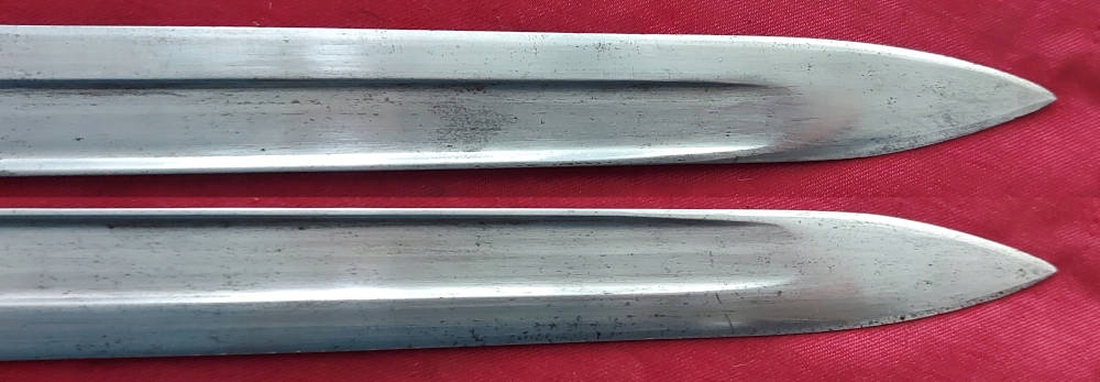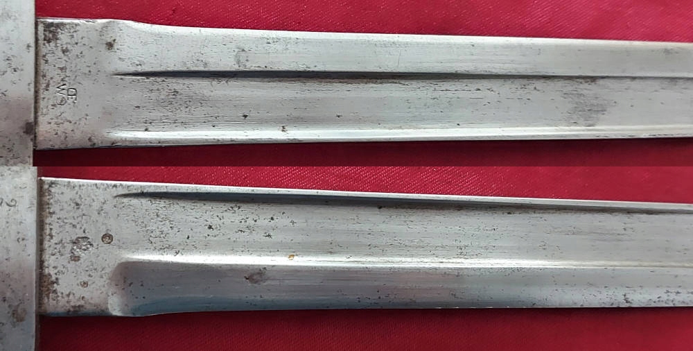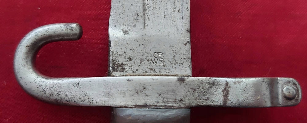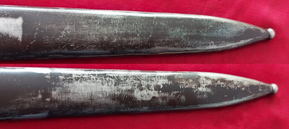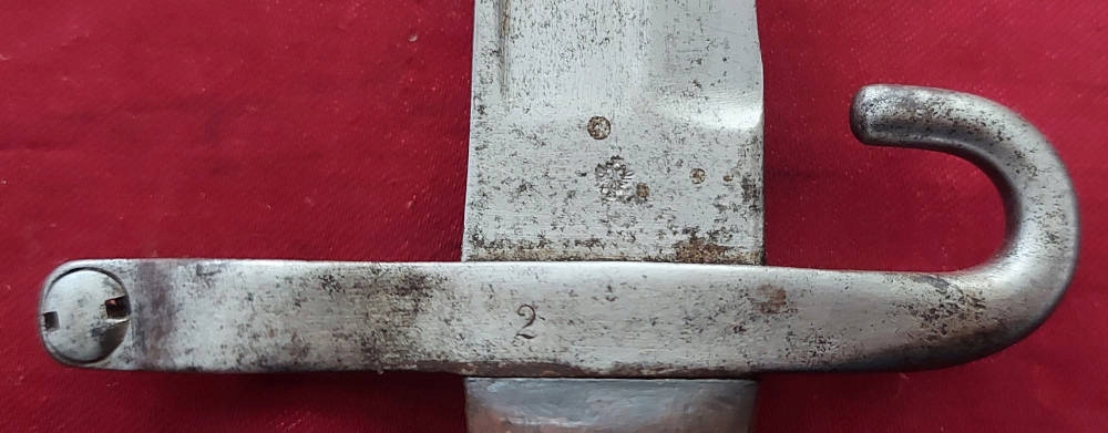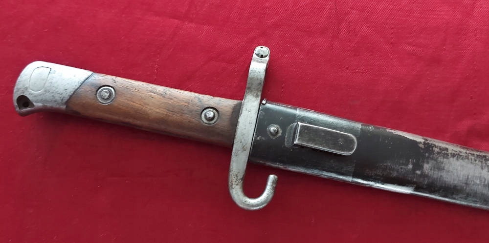 Копия видна на фотографиях. Очень хорошо сохранился. Клинок незаточенный, слегка заточенный в эпоху. На пороге клинка маркировка завода Steyr - OEWG, а на другой стороне орел CK. На перекладине выбито число 2. Накладки на ручки деревянные и оригинальные. Байонетный замок работает.