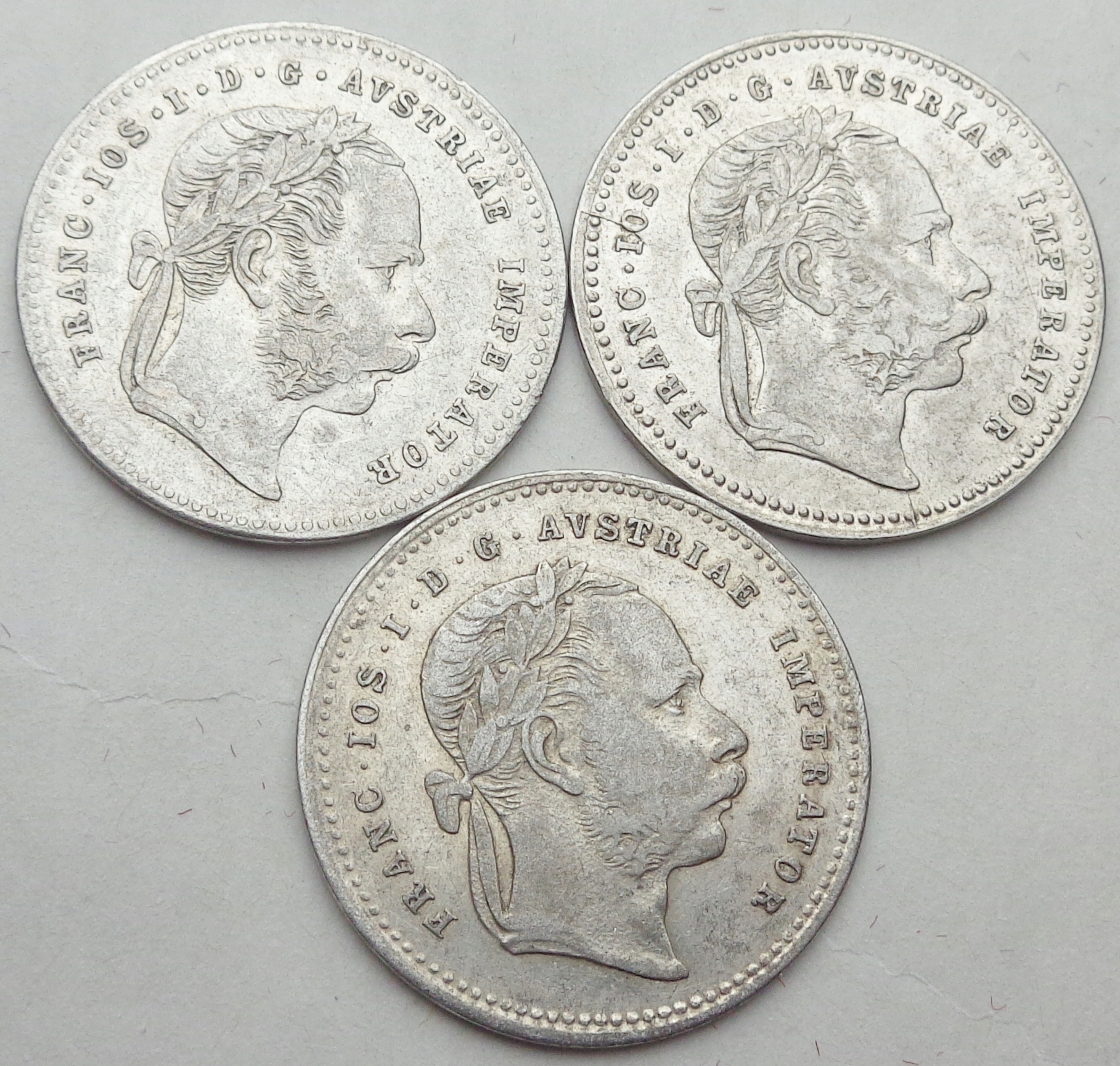 АВСТРІЯ - набір: 3 х 20 крайкарів / крейцерів: 1868 + 1869 + 1870 / срібло